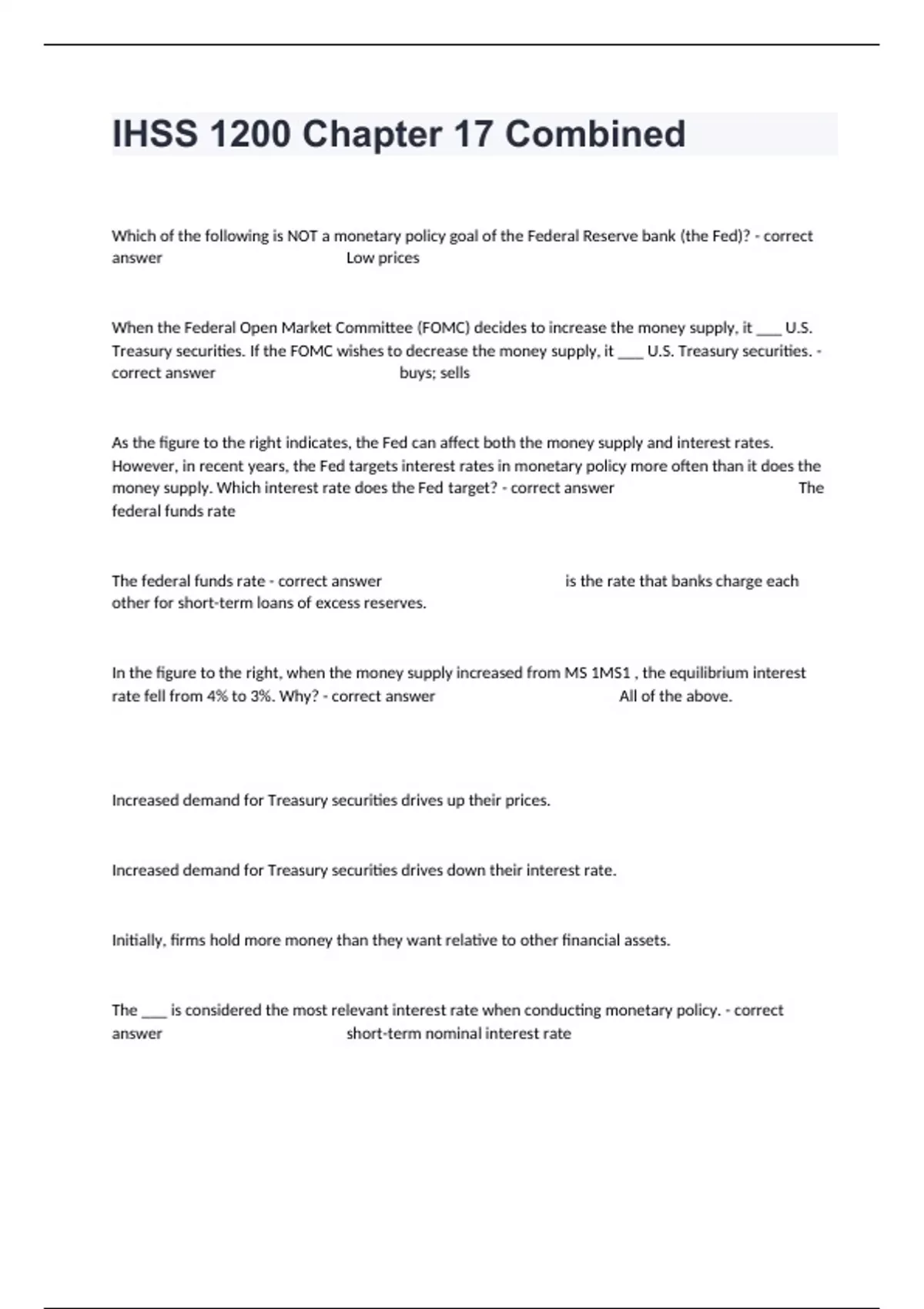 Which of the following is NOT a monetary policy goal of the Federal Reserve bank (the Fed)? - correct answer Low prices When the Federal Open Market Committee (FOMC) decides to increase the money supply, it ___ U.S. Treasury securities. If the FOMC wishes to decrease the money supply, it ___ U.S. Treasury securities. - correct answer buys; sells As the figure to the right indicates, the Fed can affect both the money supply and interest rates. However, in recent years, the Fed targets interest rates in monetary policy more often than it does the money supply. Which interest rate does the Fed target? - correct answer The federal funds rate The federal funds rate - correct answer is the rate that banks charge each other for short-term loans of excess reserves. In the figure to the right, when the money supply increased from MS 1MS1 , the equilibrium interest rate fell from 4% to 3%. Why? - correct answer All of the above. Increased demand for Treasury securities drives up their prices. Increased demand for Treasury securities drives down their interest rate. Initially, firms hold more money than they want relative to other financial assets. The ___ is considered the most relevant interest rate when conducting monetary policy. - correct answer short-term nominal interest rate In the figure to the right, the opportunity cost of holding money _______ when moving from Point A to Point B on the money demand curve. - correct answer decreases In the figure to the right, which of the following events is most likely to cause a shift in the money demand (MD) curve from MD1 to MD2 (Point A to Point C)? - correct answer Increase in real GDP or increase in the price level The Fed uses monetary policy to offset the effects of a recession (high unemployment and falling prices when actual real GDP falls short of potential GDP) and the effects of a rapid expansion (high prices and wages). Can the Fed, therefore, eliminate recessions? - correct answer The Fed can only soften the magnitude of recessions, not eliminate them. Changes in interest rates affect aggregate demand. Which of the following is affected by changes in interest rates and, as a result, impacts aggregate demand? (Mark all that apply.) - correct answer The value of the dollar Consumption of durable goods Business investment projects Consider the figures below and determine which is the best description of what causes the shift from AD1 to AD2. - correct answer Both A and B Example A (Point A is higher than point B) shows a contractionary monetary policy. The price level and real GDP both fall. Example B (Point A is lower than point B) shows an expansionary monetary policy. The price level and real GDP both rise. Suppose the economy is in equilibrium in the first period at point A. In the second period, the economy reaches point B. What policy would the Fed likely pursue in order to move AD2 to AD2, policy and reach equilibrium (point C) in the second period? (What policy will increase the price level and increase actual real GDP?) - correct answer Open market purchase of government securities If the Federal Reserve is late to recognize a recession and implements an expansionary policy too late, the result could be an increase in inflation during the beginning of the next phase. Even though the goal had been to reduce the severity of the recession, the poor timing caused another problem: inflation. This is an example of what type of policy? - correct answer Procyclical policy The figure to the right illustrates the economy using the Dynamic Aggregate Demand and Aggregate Supply Model If actual real GDP in 2006 occurs at point B and potential GDP occurs at LRAS 06LRAS06, we would expect the Federal Reserve Bank to pursue _____ monetary policy. If the Fed's policy is successful, what is the effect of the policy on the following macroeconomic indicators? Actual real GDP Potential real GDP Price level unemployment - correct answer a contractionary decreases does not change decreases increases The figure to the right illustrates a dynamic AD-AS model Suppose the economy is in equilibrium in the first period at point A. In the second period, the economy reaches point B. We would expect the Fed to pursue what type of policy in order to move AD to AD2 policy, and reach equilibrium (point C) in the second period? If the Federal Reserve Bank's policy is successful, what is the effect on the following macroeconomic indicators? Actual real GDP: Potential real GDP Price level unemployment - correct answer Expansionary monetary policy increase does not change increase decrease The figure to the right illustrates a dynamic AD-AS model Suppose the economy is in equilibrium in the first period at point A. In the second period, the economy reaches point B. What policy would the Fed likely pursue in order to move AD2 to AD2, policy and reach equilibrium (point C) in the second period? - correct answer Open market purchase of government securities. Consider the following table: 2012 $14.9 tril $14.9 tril 110 2013 $15.3 tril $15.2 tril 112 What can we expect from the Federal Reserve Bank if it seeks to move the economy in the direction of long-run macroeconomic equilibrium? - correct answer The Fed will pursue an expansionary monetary policy. I DNC I D