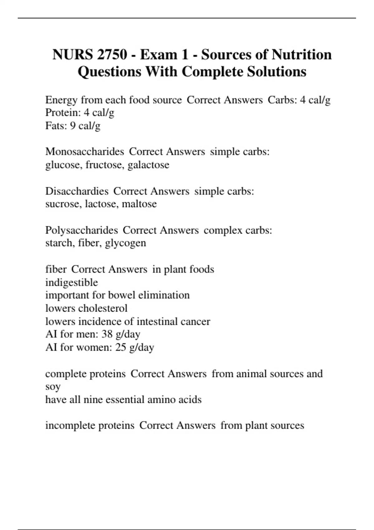 NURS 2750 - Exam 1 - Sources of Nutrition Questions With Complete Solutions