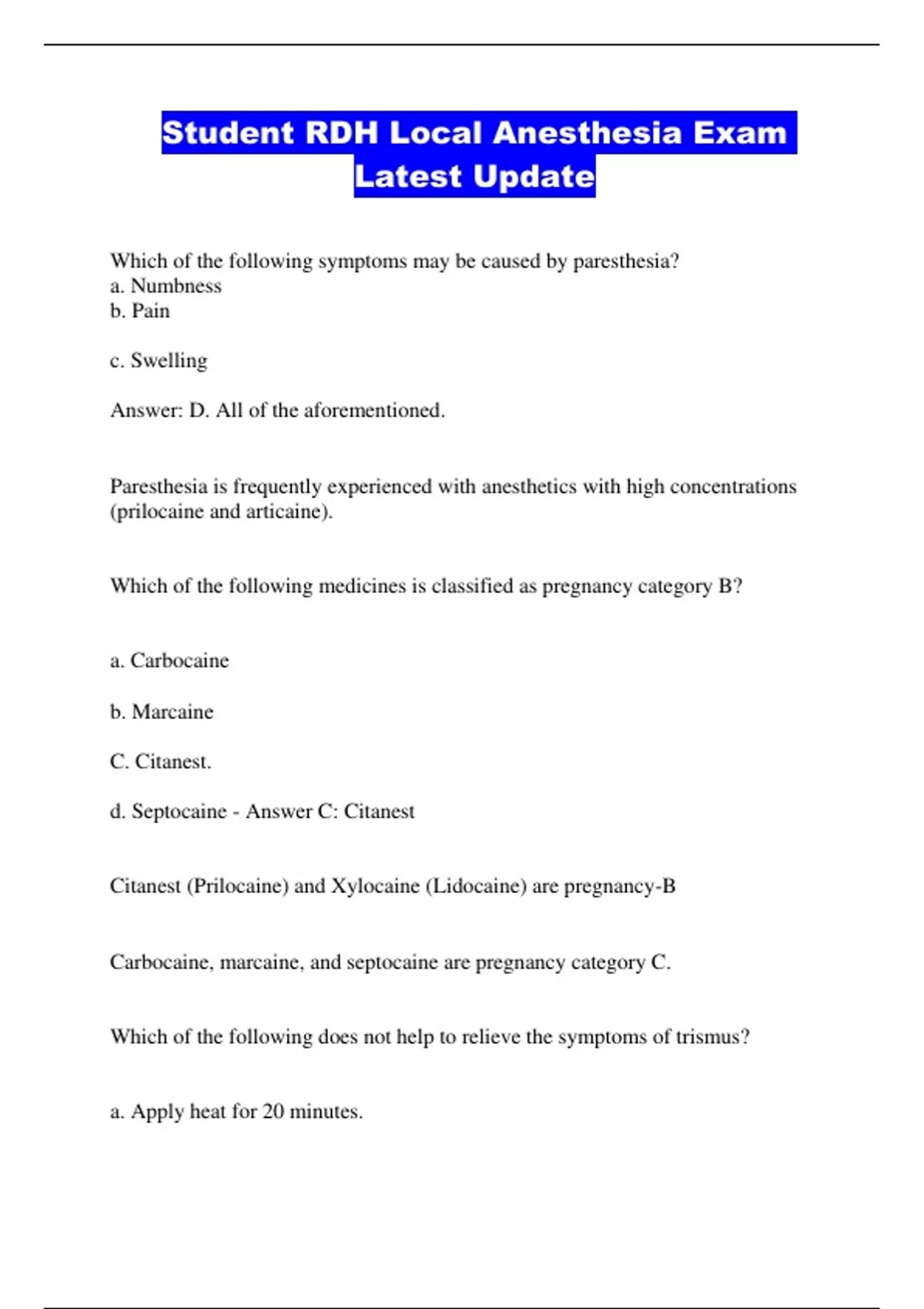 Student RDH Local Anesthesia Exam
