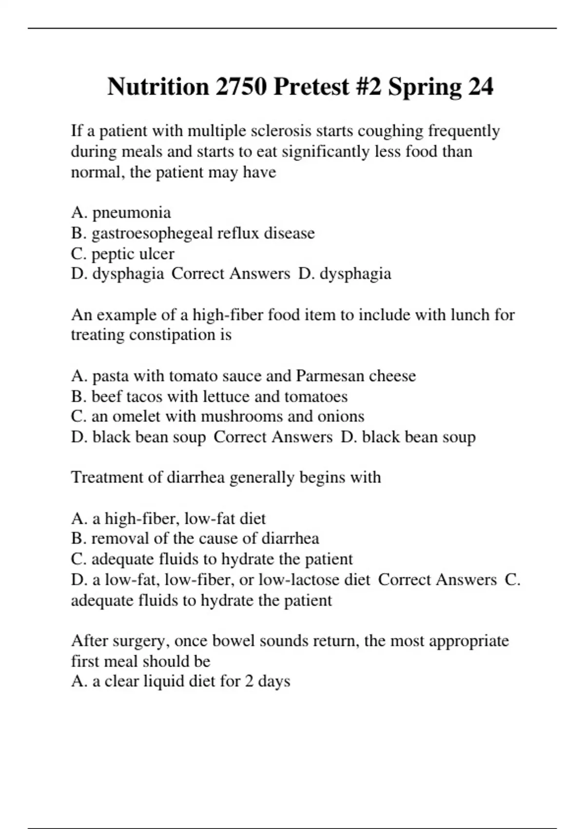 D. a low-fat, low-fiber, or low-lactose diet Correct Answers C.