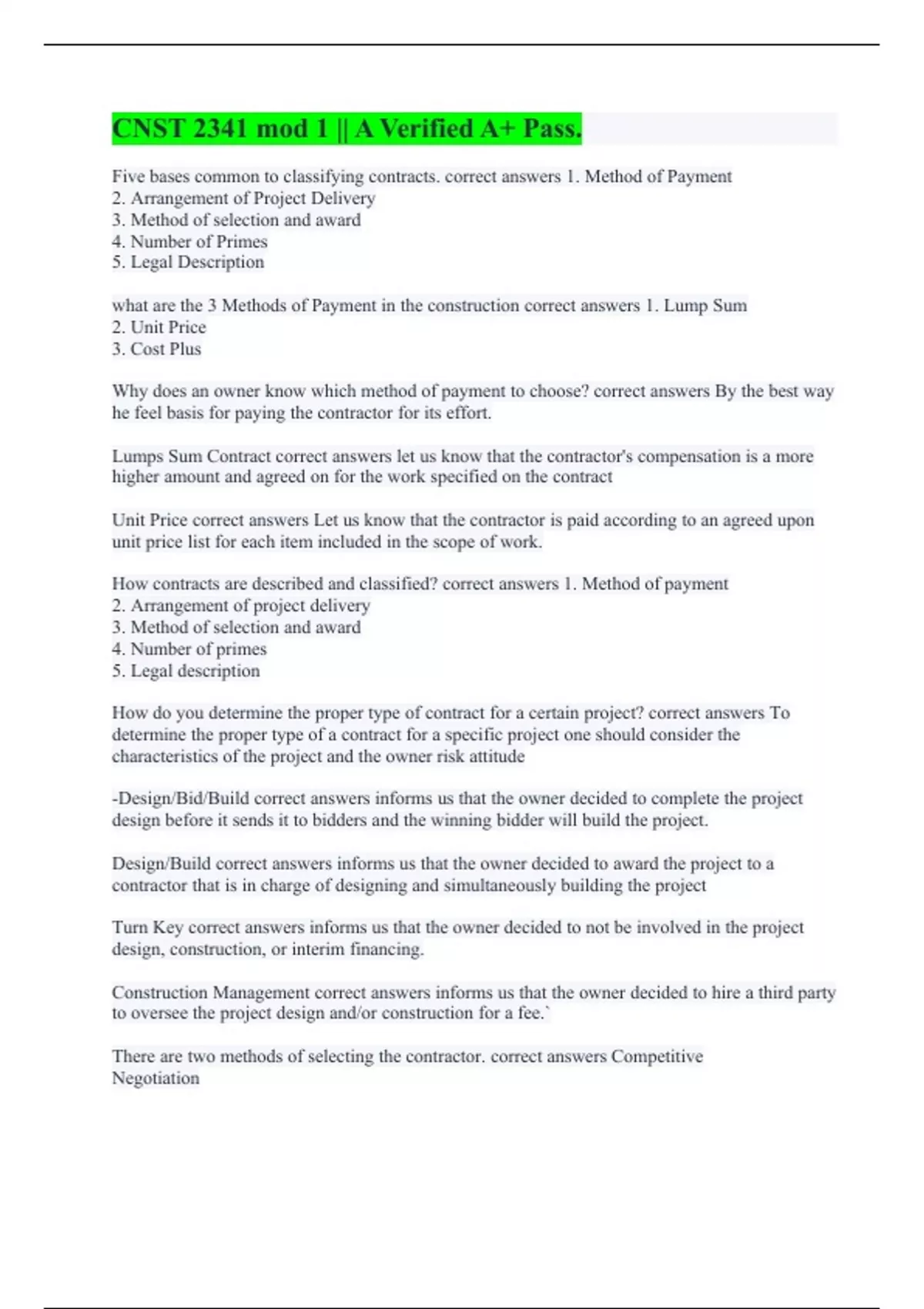How contracts are described and classified? correct answers 1. Method of payment