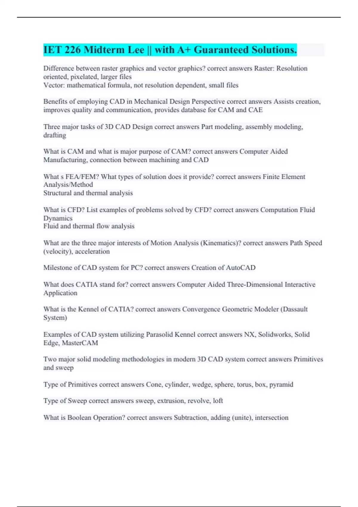 Difference between raster graphics and vector graphics? correct answers Raster: Resolution oriented, pixelated, larger files Vector: mathematical formula, not resolution dependent, small files Benefits of employing CAD in Mechanical Design Perspective correct answers Assists creation, improves quality and communication, provides database for CAM and CAE Three major tasks of 3D CAD Design correct answers Part modeling, assembly modeling, drafting What is CAM and what is major purpose of CAM? correct answers Computer Aided Manufacturing, connection between machining and CAD What s FEA/FEM? What types of solution does it provide? correct answers Finite Element Analysis/Method Structural and thermal analysis What is CFD? List examples of problems solved by CFD? correct answers Computation Fluid Dynamics Fluid and thermal flow analysis What are the three major interests of Motion Analysis (Kinematics)? correct answers Path Speed (velocity), acceleration Milestone of CAD system for PC? correct answers Creation of AutoCAD What does CATIA stand for? correct answers Computer Aided Three-Dimensional Interactive Application What is the Kennel of CATIA? correct answers Convergence Geometric Modeler (Dassault System) Examples of CAD system utilizing Parasolid Kennel correct answers NX, Solidworks, Solid Edge, MasterCAM Two major solid modeling methodologies in modern 3D CAD system correct answers Primitives and sweep Type of Primitives correct answers Cone, cylinder, wedge, sphere, torus, box, pyramid Type of Sweep correct answers sweep, extrusion, revolve, loft What is Boolean Operation? correct answers Subtraction, adding (unite), intersection