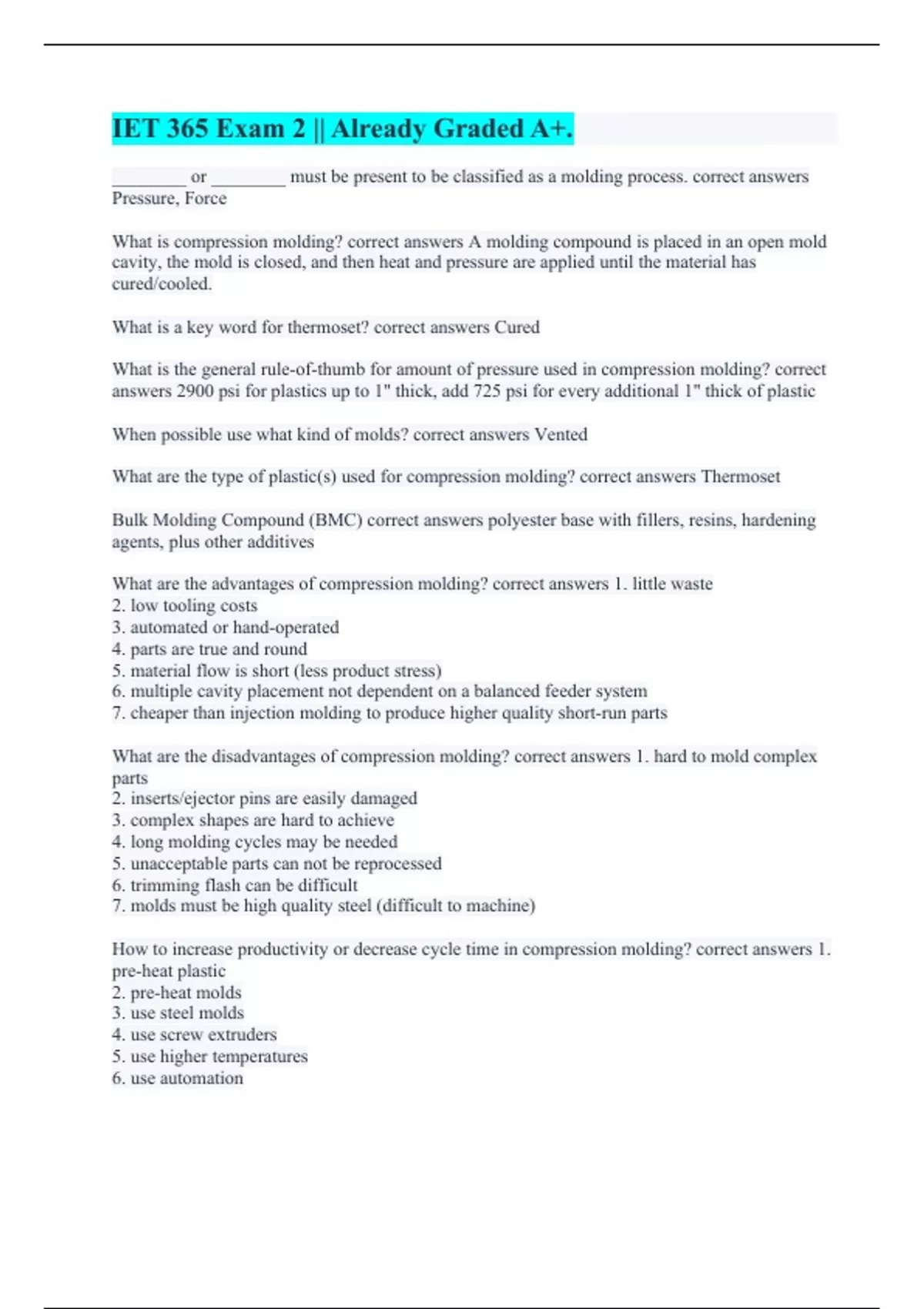 ________ or ________ must be present to be classified as a molding process. correct answers Pressure, Force What is compression molding? correct answers A molding compound is placed in an open mold cavity, the mold is closed, and then heat and pressure are applied until the material has cured/cooled. What is a key word for thermoset? correct answers Cured What is the general rule-of-thumb for amount of pressure used in compression molding? correct answers 2900 psi for plastics up to 1" thick, add 725 psi for every additional 1" thick of plastic When possible use what kind of molds? correct answers Vented What are the type of plastic(s) used for compression molding? correct answers Thermoset Bulk Molding Compound (BMC) correct answers polyester base with fillers, resins, hardening agents, plus other additives What are the advantages of compression molding? correct answers 1. little waste 2. low tooling costs 3. automated or hand-operated 4. parts are true and round 5. material flow is short (less product stress) 6. multiple cavity placement not dependent on a balanced feeder system 7. cheaper than injection molding to produce higher quality short-run parts What are the disadvantages of compression molding? correct answers 1. hard to mold complex parts 2. inserts/ejector pins are easily damaged 3. complex shapes are hard to achieve 4. long molding cycles may be needed 5. unacceptable parts can not be reprocessed 6. trimming flash can be difficult 7. molds must be high quality steel (difficult to machine) How to increase productivity or decrease cycle time in compression molding? correct answers 1. pre-heat plastic 2. pre-heat molds 3. use steel molds 4. use screw extruders 5. use higher temperatures 6. use automation