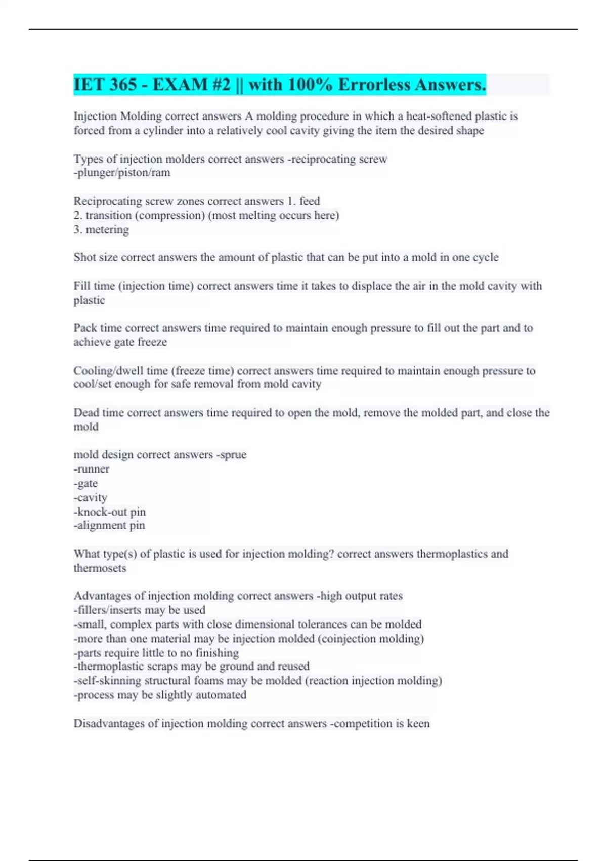 Injection Molding correct answers A molding procedure in which a heat-softened plastic is