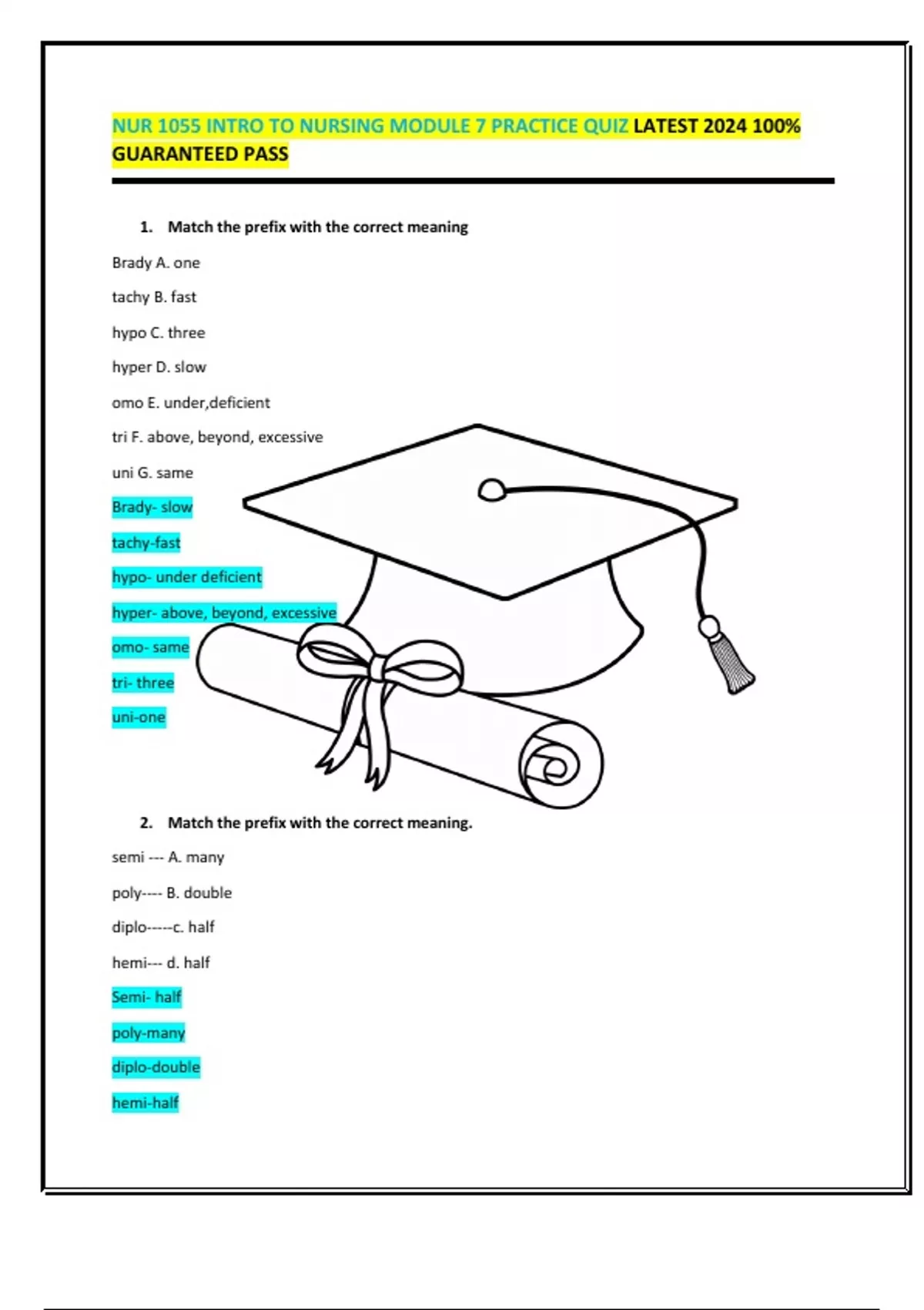 NUR 1055 INTRO TO NURSING MODULE 7 PRACTICE QUIZ LATEST 2024 100% GUARANTEED PASS 1. Match the prefix with the correct meaning Brady A. one tachy B. fast hypo C. three hyper D. slow omo E. under,deficient tri F. above, beyond, excessive uni G. same