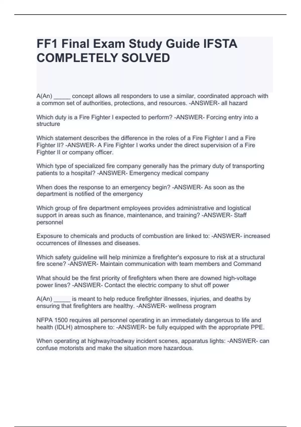 FF1 Final Exam Study Guide IFSTA COMPLETELY SOLVED