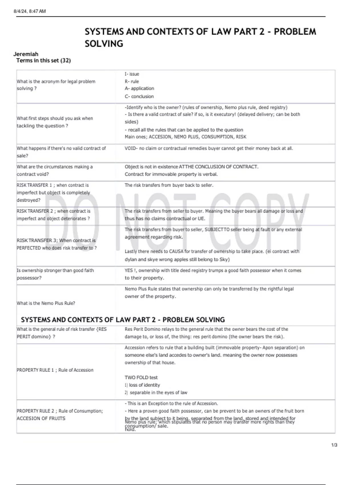 SYSTEMS AND CONTEXTS OF LAW PART 2 - PROBLEM SOLVING Terms in this set (32) What is the acronym for legal problem solving ? I- issue R- rule A- application C- conclusion What first steps should you ask when tackling the question ? -Identify who is the owner? (rules of ownership, Nemo plus rule, deed registry) - Is there a valid contract of sale? if so, is it executory! (delayed delivery; can be both sides) - recall all the rules that can be applied to the question Main ones; ACCESION, NEMO PLUS, CONSUMPTION, RISK What happens if there's no valid contract of sale? VOID- no claim or contractual remedies buyer cannot get their money back at all. What are the circumstances making a contract void? Object is not in existence AT THE CONCLUSION OF CONTRACT. Contract for immovable property is verbal. RISK TRANSFER 1 ; when contract is imperfect but object is completely destroyed? The risk transfers from buyer back to seller. RISK TRANSFER 2 ; when contract is imperfect and object deteriorates ? The risk transfers from seller to buyer. Meaning the buyer bears all damage or loss and thus has no claims contractual or UE. RISK TRANSFER 3; When contract is PERFECTED who does risk transfer to ? The risk transfers from buyer to seller, SUBJECT TO seller being at fault or any external agreement regarding risk. Lastly there needs to CAUSA for transfer of ownership to take place. (ei contract with dylan and skye wrong apples still belong to Sky) Is ownership stronger than good faith possessor? YES !, ownership with title deed registry trumps a good faith possessor when it comes to their property. What is the Nemo Plus Rule? Nemo Plus Rule states that ownership can only be transferred by the rightful legal owner of the property. SYSTEMS AND CONTEXTS OF LAW PART 2 - PROBLEM SOLVING What is the general rule of risk transfer {RES PERIT domino} ? Res Perit Domino relays to the general rule that the owner bears the cost of the damage to, or loss of, the thing: res perit domino (the owner bears the risk). PROPERTY RULE 1 ; Rule of Accession Accession refers to rule that a building built (immovable property- Apon separation) on someone else's land accedes to owner's land. meaning the owner now possesses ownership of that house. TWO FOLD test 1) loss of identity 2) separable in the eyes of law PROPERTY RULE 2 ; Rule of Consumption; ACCESION OF FRUITS - This is an Exception to the rule of Accession. - Here a proven good faith possessor, can be prevent to be an owners of the fruit born by the land subject to it being, separated from the land, stored and intended for consumption/ sale. Consumption Rule; What is the exception to the good faith possessor having ownership of fruits? The rightful owner of the land the fruits acceded to can claim the value of unconsumed fruits. Claim in Rem; Rei Vindicatio. What constitutes a good faith possessor ? Corpus Animus INcorpeal and corpeal possession - physical control of object. mental understanding that they are the owner of object. Can a Bad Faith Possessor claim anything? NO! - bad faith refers to person knowing that it is not their object. What are the two CONTRACTUAL REMDIES? Breach of Contract & Specific Performance this is under CLAIM IN PERSONAM - full consequential loss, specification. DEFINE SPECIFIC PERFORMANCE? . It's an order of the court directing the party in a breach to carry-out a specific obligation. Can only be rewarded when there's no object in existence to carry out agreed performance. What is a claim for unjustified enrichment and when can it be applied? U E refers to the remedy to allow a party to be restored back to the original position pre contract. As the other party has been enriched at the expense of the impoverished party. - CAN ONLY CLAIM IF THERES NO VAILD CONTRACT FOR CONTRACTUAL REMEDIES. What are the various umbrella claims to state when answering a question? CONTRACT LAW , LAW OF OBLIGATIONS. REM, PERSONAM How to tackle an issue where seller is insolvent/ liquidated / bankrupt? When seller is insolvent a buyer may still claim in personam (if ownership not transferred as yet not delivered as of yet?) * Claim in rem or rei Vindi if object delivered and you as buyer has ownership. The buyer will be ranked in position amongst the sellers' debtors and will be afforded a portion of his estate according to the value of object. What is the rule of accession in the instance of a GFP's claim against the owner? GFP may claim in personam in Unjustified enrichment for outlay costs of a house built or paid for with their own money on the owners land. What is Occupatio ? This is a type of original acquisition in which someone occupies a property that is not owned by anyone. IMPORTANT OBSERVATION Performance of a void contract gives rise to a claim of unjustified enrichment to put the parties back to the positions they were in before the void transaction was performed. Servitude (Ownership) Is a claim in rem, is to enhance the utility of one piece of land at the expense of another. image of road in Land A is permitted by Owner A to be used to access Land B. Claim in REM SYSTEMS AND CONTEXTS OF LAW PART 2 - PROBLEM SOLVING WHERE THERE IS A VALID CONTRACT WHAT MUST YOU THINK OF NEXT ? Contractual remedies; breach of contract specific performance Remember ! What constitutes a breach of contract ? Common; no peaceful undisturbed possession of house or land. Performance: did not perform the duty or deliver the term of contract. NO CAUSA means ? no transfer of ownership over something. Claim in Rem law of property, can use rei vindicatio to recover object absolute right of pursuit as lega owner of object Ownership Requirement Delivery, there needs to delivery for the transfer of ownership to take place Special Protection afford to Owners (in rem) Requires that there must be special public delivery. Eg Land and buildings require ownership to be sealed by registration of new own title in public register of ownership (DEEDS) Bankruptcy When D cannot pay all his credi