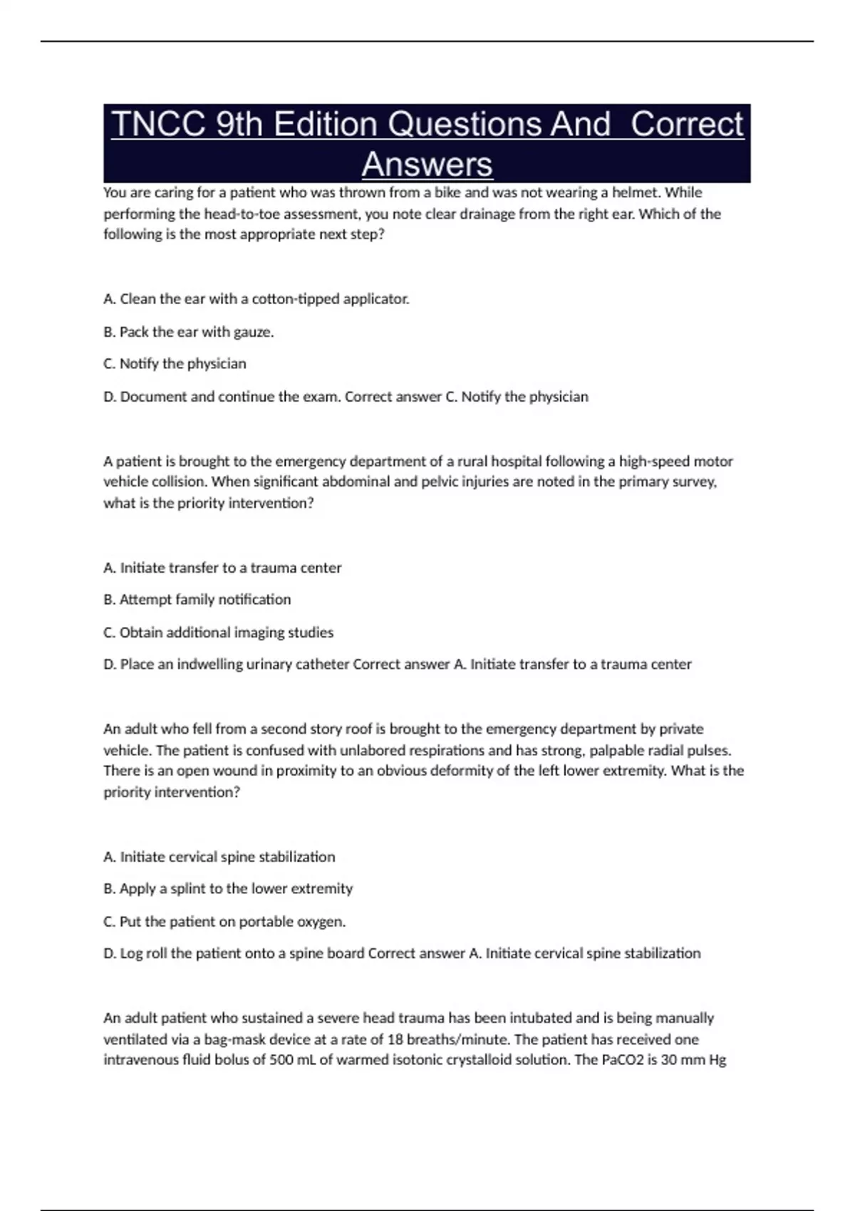 D. Log roll the patient onto a spine board Correct answer A. Initiate cervical spine stabilization