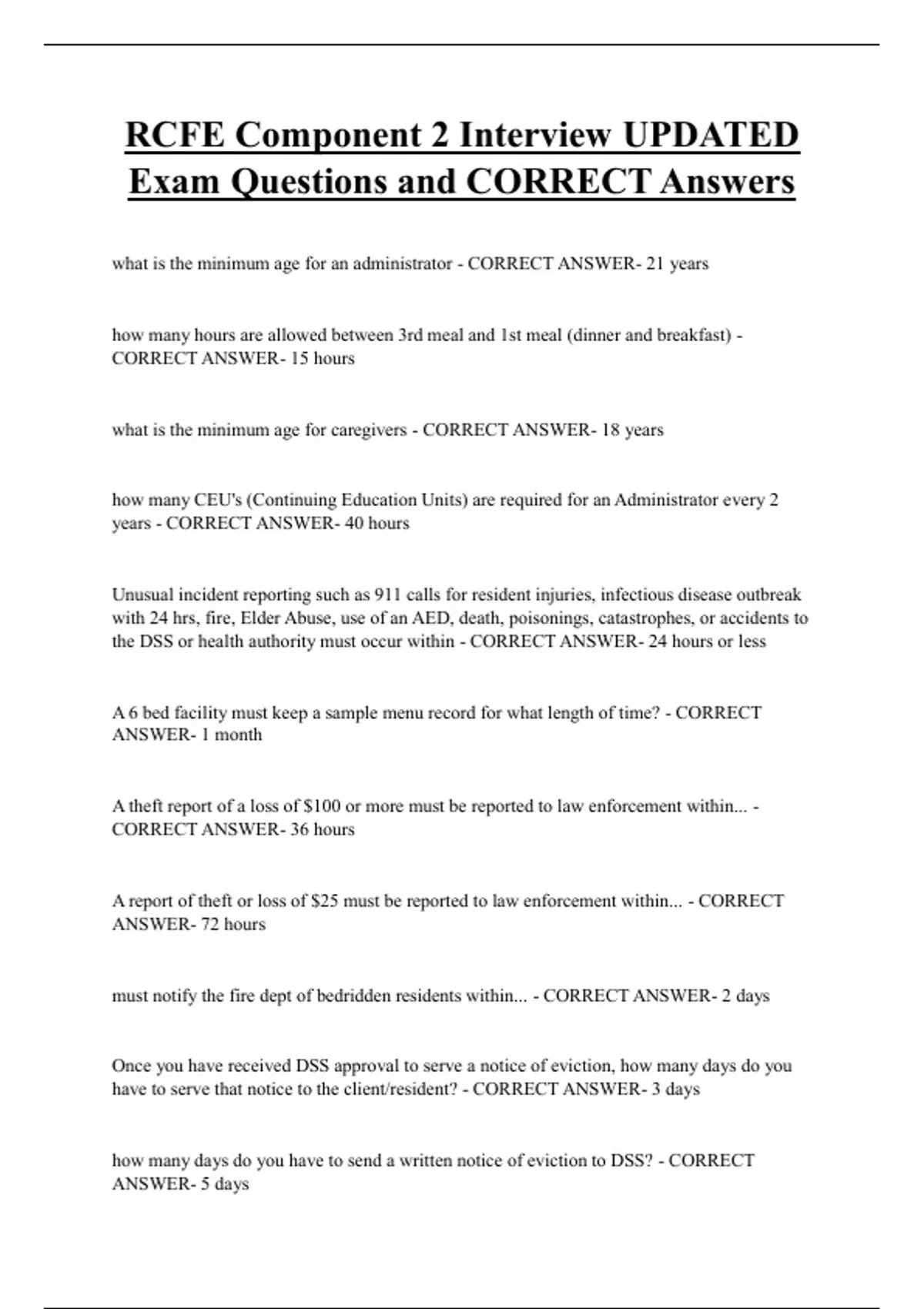 RCFE Component 2 Interview UPDATED Exam Questions and CORRECT Answers what is the minimum age for an administrator - CORRECT ANSWER- 21 years how many hours are allowed between 3rd meal and 1st meal (dinner and breakfast) - CORRECT ANSWER- 15 hours what is the minimum age for caregivers - CORRECT ANSWER- 18 years how many CEU's (Continuing Education Units) are required for an Administrator every 2 years - CORRECT ANSWER- 40 hours