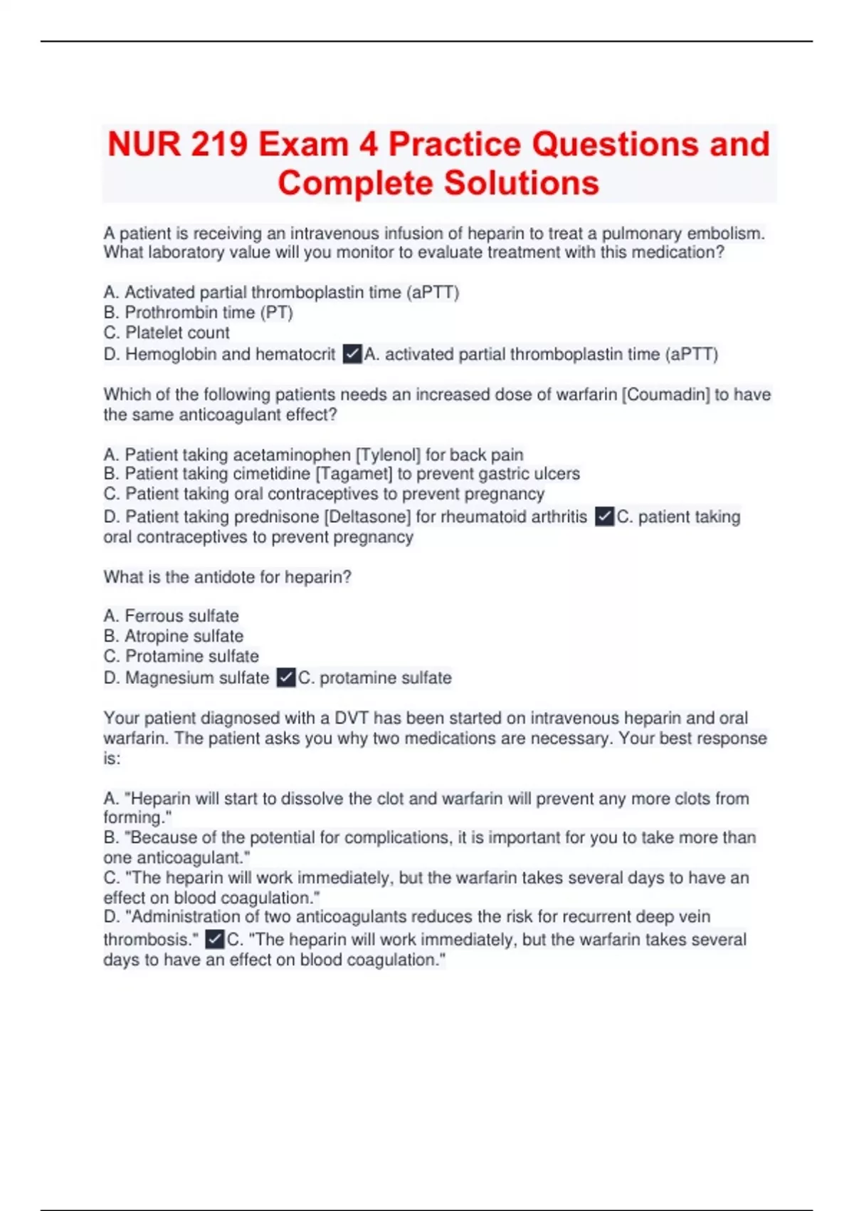 A patient is receiving an intravenous infusion of heparin to treat a pulmonary embolism. What laboratory value will you monitor to evaluate treatment with this medication? A. Activated partial thromboplastin time (aPTT) B. Prothrombin time (PT) C. Platelet count D. Hemoglobin and hematocrit A. activated partial thromboplastin time (aPTT) Which of the following patients needs an increased dose of warfarin [Coumadin] to have the same anticoagulant effect? A. Patient taking acetaminophen [Tylenol] for back pain B. Patient taking cimetidine [Tagamet] to prevent gastric ulcers C. Patient taking oral contraceptives to prevent pregnancy D. Patient taking prednisone [Deltasone] for rheumatoid arthritis C. patient taking oral contraceptives to prevent pregnancy What is the antidote for heparin? A. Ferrous sulfate B. Atropine sulfate C. Protamine sulfate D. Magnesium sulfate C. protamine sulfate Your patient diagnosed with a DVT has been started on intravenous heparin and oral warfarin. The patient asks you why two medications are necessary. Your best response is: A. "Heparin will start to dissolve the clot and warfarin will prevent any more clots from forming." B. "Because of the potential for complications, it is important for you to take more than one anticoagulant." C. "The heparin will work immediately, but the warfarin takes several days to have an effect on blood coagulation." D. "Administration of two anticoagulants reduces the risk for recurrent deep vein thrombosis." C. "The heparin will work immediately, but the warfarin takes several days to have an effect on blood coagulation."