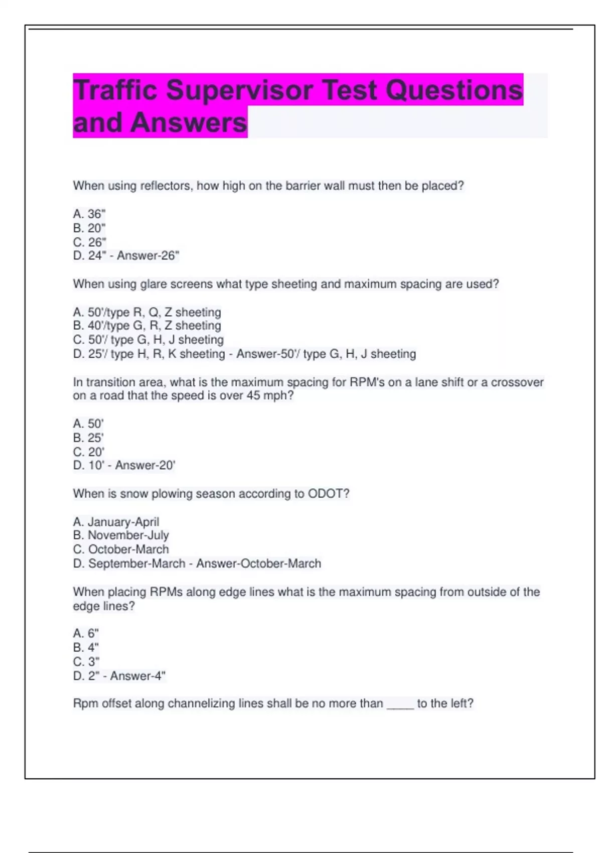 Traffic Supervisor Test Questions and Answers When using reflectors, how high on the barrier wall must then be placed? A. 36" B. 20" C. 26" D. 24" - Answer-26" When using glare screens what type sheeting and maximum spacing are used? A. 50'/type R, Q, Z sheeting B. 40'/type G, R, Z sheeting C. 50'/ type G, H, J sheeting D. 25'/ type H, R, K sheeting - Answer-50'/ type G, H, J sheeting In transition area, what is the maximum spacing for RPM's on a lane shift or a crossover on a road that the speed is over 45 mph? A. 50' B. 25' C. 20' D. 10' - Answer-20' When is snow plowing season according to ODOT? A. January-April B. November-July C. October-March D. September-March - Answer-October-March When placing RPMs along edge lines what is the maximum spacing from outside of the edge lines? A. 6" B. 4" C. 3" D. 2" - Answer-4"