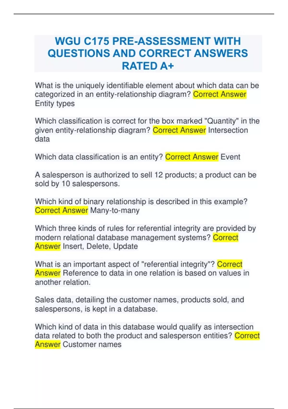 WGU C175 PRE-ASSESSMENT WITH QUESTIONS AND CORRECT ANSWERS RATED A+