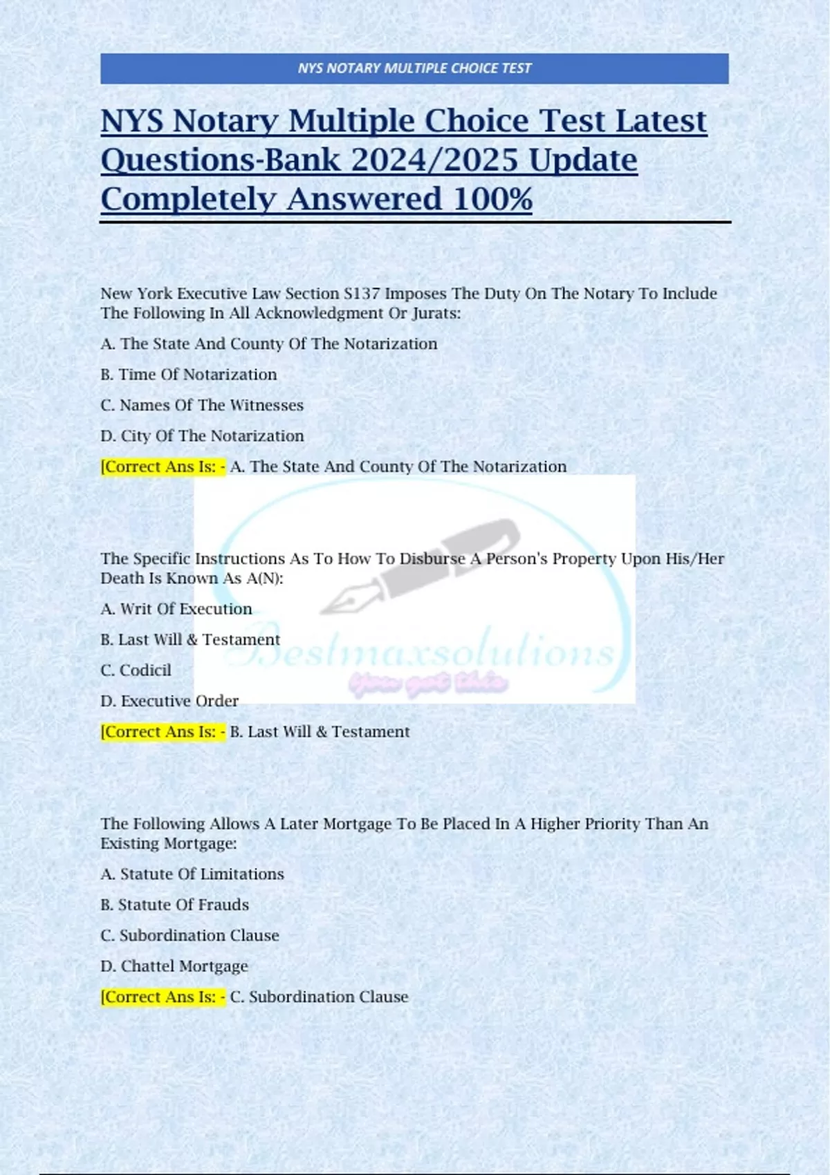 , NYS NOTARY MULTIPLE CHOICE TEST