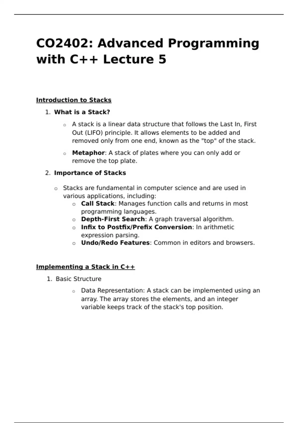 This document contains the lecture notes from Lecture 5 of the CO2402 course on Advanced Programming with C++. The focus of this lecture is on the stack data structure, a fundamental concept in computer science that operates on the Last In, First Out (LIFO) principle. The notes cover the basics of stacks, including their definition, importance, and various real-world applications such as call stack management, depth-first search, and infix to postfix conversion.