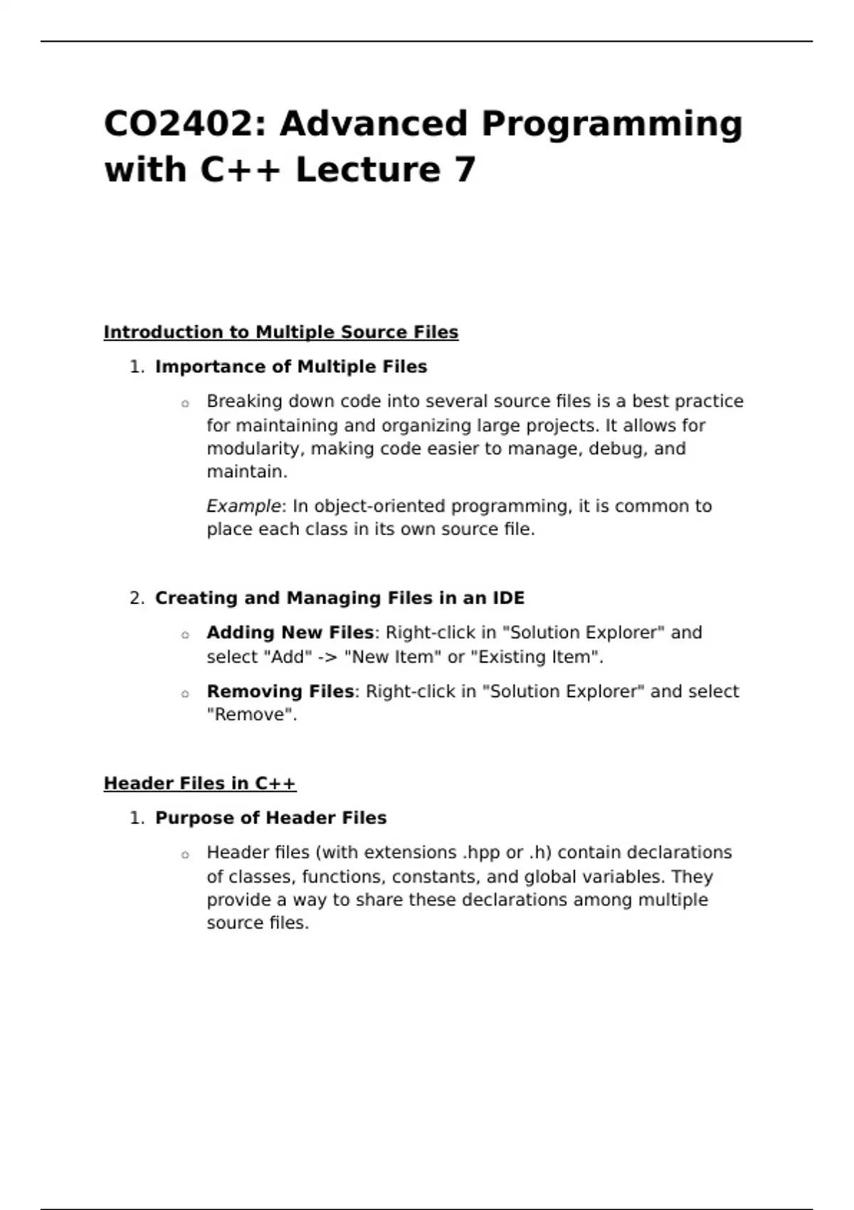 o Header files (with extensions .hpp or .h) contain declarations