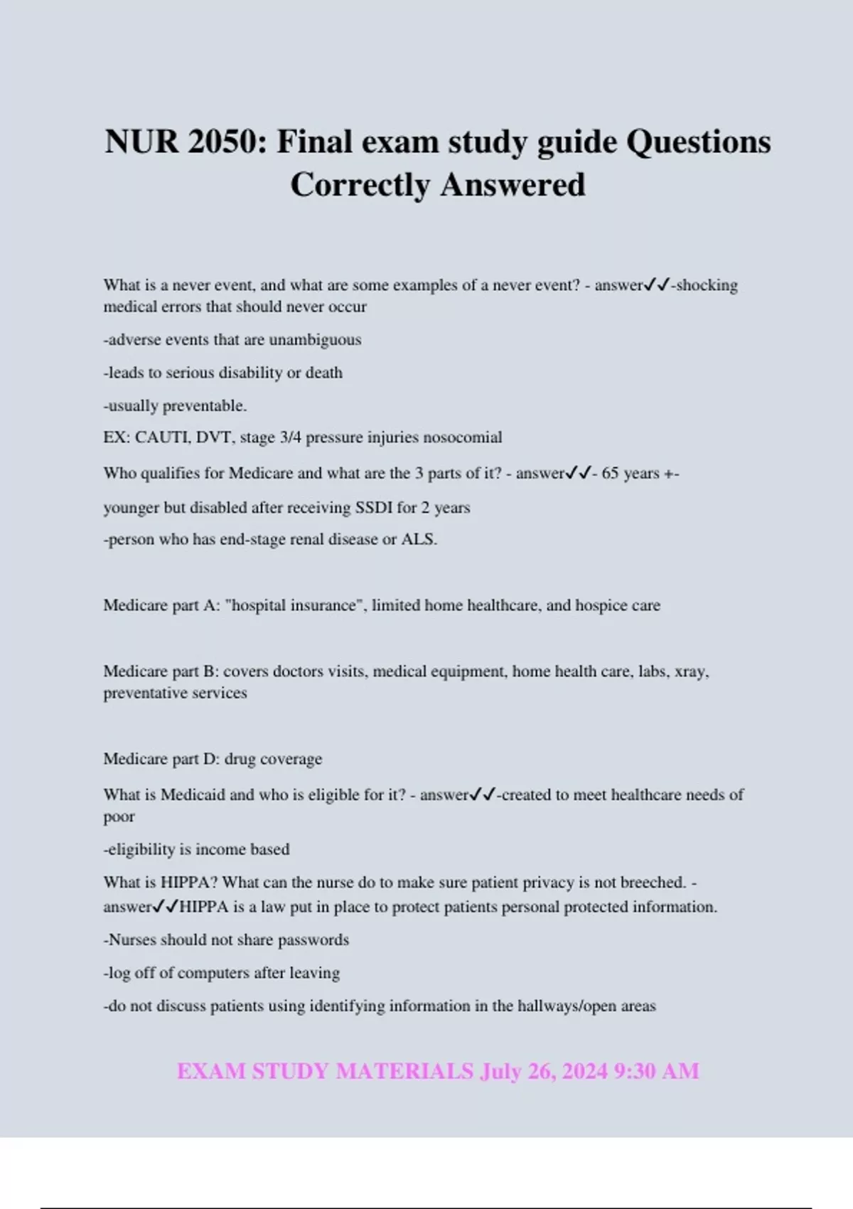 EXAM STUDY MATERIALS July 26, 2024 9:30 AM NUR 2050: Final exam study guide Questions Correctly Answered What is a never event, and what are some examples of a never event? - answer-shocking medical errors that should never occur -adverse events that are unambiguous -leads to serious disability or death -usually preventable. EX: CAUTI, DVT, stage 3/4 pressure injuries nosocomial Who qualifies for Medicare and what are the 3 parts of it? - answer- 65 years +- younger but disabled after receiving SSDI for 2 years -person who has end-stage renal disease or ALS. Medicare part A: "hospital insurance", limited home healthcare, and hospice care Medicare part B: covers doctors visits, medical equipment, home health care, labs, xray, preventative services Medicare part D: drug coverage What is Medicaid and who is eligible for it? - answer-created to meet healthcare needs of poor -eligibility is income based What is HIPPA? What can the nurse do to make sure patient privacy is not breeched. - answerHIPPA is a law put in place to protect patients personal protected information. -Nurses should not share passwords -log off of computers after leaving -do not discuss patients using identifying information in the hallways/open areas EXAM STUDY MATERIALS July 26, 2024 9:30 AM What is orthostatic hypotension? What should be done to prevent this? - answerdecreased ability to equalize blood supply when moving from a lying to standing position -results is a drop of 20+ in systolic pressure OR a drop of 10+ in diastolic pressure. -treat underlying cause such as dehydration -try to ambulate patient slowly Nursing interventions to prevent pressure ulcers and DVT? - answerDVT Prevention: -TED hoses-sequential compression device, ambulation/range of motion Pressure injuries: Repositioning every 2 hours, use of wedges/pillows under bony prominences, preventative dressings over bony prominences. What are sequential compression devices? - answerInflatable sleeves that wrap around the legs that inflate with air one at a time to mimic walking. These are used to prevent DVT's. Antidote for coumadin and heparin - answer-Coumadin: vitamin K -Heparin: protamine sulfate What should a nurse monitor for after an Esophagogastroduodenoscopy (EGD)? - answer- Monitor vital signs (blood pressure, pulse, respiration) - as ordered Give the client throat lozenges or analgesics for throat discomfort. - Inform the client that he or she may have flatus or burp-up gas, which is normal. -Monitor for return of gag reflex What should a nurse monitor for after a colonoscopy? - answer-Observe the patient closely for signs of bowel perforation. Signs of bowel perforations such as severe abdominal pain, nausea, vomiting, fever, and chills must be reported immediately. -Rectal bleeding What is thrombocytopenia? Symptom presentation? - answer-Decrease in platelet count, includes decreased production and survival, and increased destruction (under 140,000) Panic level= less than 20,000 S/s-spontaneous/prolonged bleeding, petechiae, and ecchymosis What are nursing interventions/teaching for someone with thrombocytopenia? - answer- Protect from injury, monitor for bleeding/bruising/red patches (petechiae and ecchymosis) EXAM STUDY MATERIALS July 26, 2024 9:30 AM -Avoid IM injections, strenuous activities, aspirin/NSAIDs/anticoagulants, or sharp foods -Put prolonged pressure over injection/venipuncture sites -Use electric razors, and eat cooked food (mushy/soft) -No enemas or rectal temp., use stool softeners to avoid hemorrhoids from straining What are safety concerns or interventions for pt going under a MRI? - answer-Preprocedural ---Screen for internal/external metal objects ---Tattoos can swell/burn, won't last long -Procedure ---Lie very still, ear plugs available since a "crushing metal" noise can be heard ---Metal fillings in teeth may tingle ---If pt is claustrophobic may use sedatives -Contraindications ---Pregnancy, epilepsy, implanted devices ---If use of non-iodinated contrast is used, pt with renal disease What are safety concerns or interventions for pt going under a CT scan? - answer- Preprocedural ---Assess for allergy to iodine, if it exists do not use contrast. If contrast needed might need Benadryl & prednisone prescription ---Obtain written consent, may be N