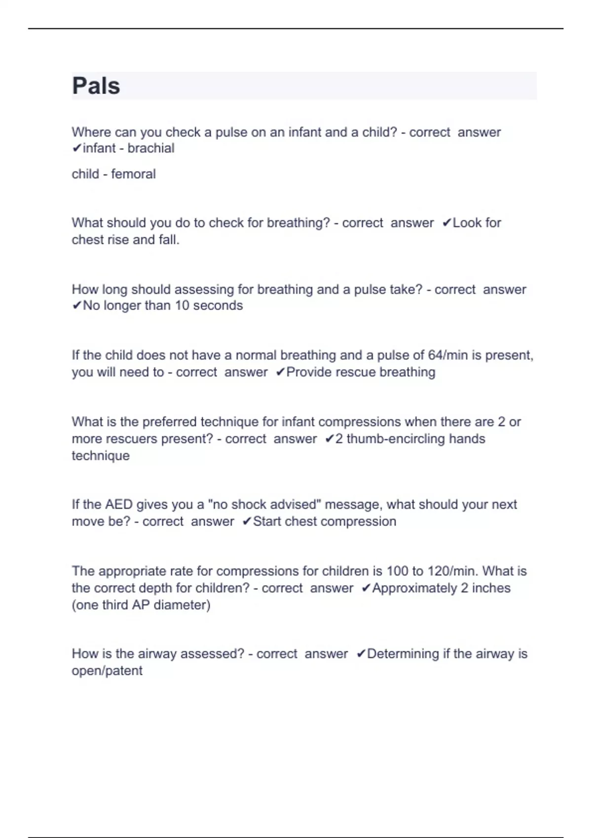 Pals1 Question and answers 100% correct Pals Where can you check a pulse on an infant and a child? - correct answer infant - brachial child - femoral What should you do to check for breathing? - correct answer Look for chest rise and fall. How long should assessing for breathing and a pulse take? - correct answer No longer than 10 seconds If the child does not have a normal breathing and a pulse of 64/min is present, you will need to - correct answer Provide rescue breathing What is the preferred technique for infant compressions when there are 2 or more rescuers present? - correct answer 2 thumb-encircling hands technique If the AED gives you a "no shock advised" message, what should your next move be? - correct answer Start chest compression The appropriate rate for compressions for children is 100 to 120/min. What is the correct depth for children? - correct answer Approximately 2 inches (one third AP diameter) How is the airway assessed? - correct answer Determining if the airway is open/patent