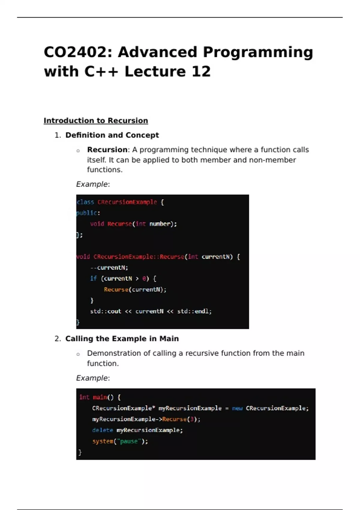 This document contains detailed notes from Lecture 12 of the CO2402 course on Advanced Programming with C++. The lecture explores the concept of recursion, a fundamental programming technique where a function calls itself. It provides a comprehensive overview of recursion, including its key characteristics, such as the necessity of a base case to prevent infinite loops.