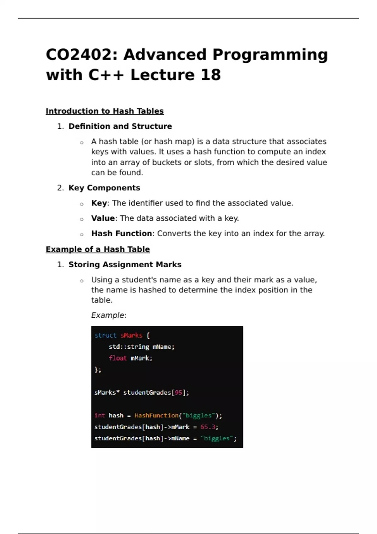 This document provides comprehensive notes from Lecture 18 of the CO2402 course on Advanced Programming with C++. The lecture delves into hash tables, a fundamental data structure used for efficient data storage and retrieval. Hash tables, also known as hash maps, use a hash function to map keys to specific locations in an array, allowing for quick access to associated values.