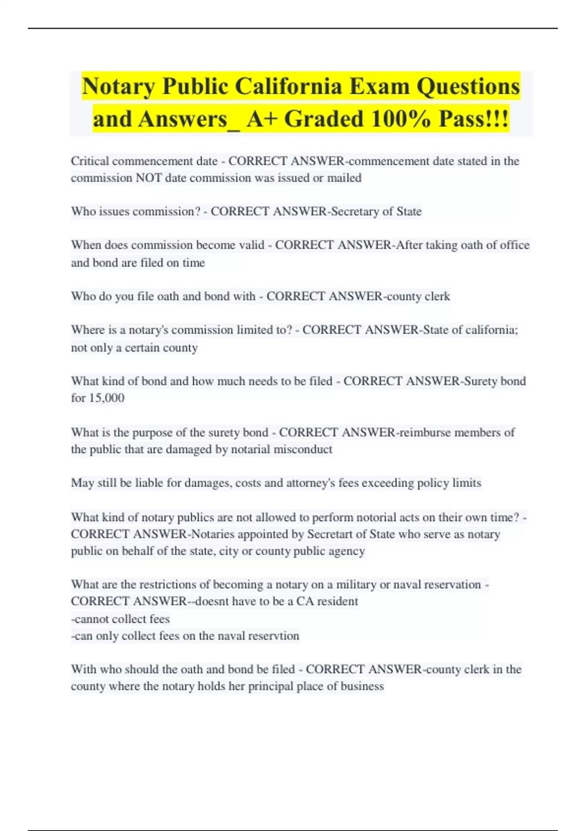 Notary Public California Exam Questions and Answers_ A+ Graded 100% Pass!!! Critical commencement date - CORRECT ANSWER-commencement date stated in the commission NOT date commission was issued or mailed Who issues commission? - CORRECT ANSWER-Secretary of State When does commission become valid - CORRECT ANSWER-After taking oath of office and bond are filed on time Who do you file oath and bond with - CORRECT ANSWER-county clerk Where is a notary's commission limited to? - CORRECT ANSWER-State of california; not only a certain county What kind of bond and how much needs to be filed - CORRECT ANSWER-Surety bond for 15,000 What is the purpose of the surety bond - CORRECT ANSWER-reimburse members of the public that are damaged by notarial misconduct May still be liable for damages, costs and attorney's fees exceeding policy limits What kind of notary publics are not allowed to perform notorial acts on their own time? - CORRECT ANSWER-Notaries appointed by Secretart of State who serve as notary public on behalf of the state, city or county public agency What are the restrictions of becoming a notary on a military or naval reservation - CORRECT ANSWER--doesnt have to be a CA resident -cannot collect fees -can only collect fees on the naval reservtion With who should the oath and bond be filed - CORRECT ANSWER-county clerk in the county where the notary holds her principal place of business How much time and who must a notary notify of an address change? - CORRECT ANSWER-Notify Secretary of State by certified mail within 30 days of changing residence or business address Fine for failing to notify of address change: - CORRECT ANSWER-$500 What are the two duties to respond to written requests - CORRECT ANSWER-1-respond in 30 days to written requests for information 2-respond in time specified when certified copies of journal are requested Can an employer request that fees be turned over to employer? - CORRECT ANSWER-yes. How many journals can a notary keep - CORRECT ANSWER-one Who can request photostatic copies of a notary's journal? - CORRECT ANSWER--any member of the general public can request to see their line item in the journal What must the request include when requesting copies of a notorial journal - CORRECT ANSWER--Name of properties -type of document -month and year the act occurred Maximum fee per page of copy requests - CORRECT ANSWER-$0.30 How long does the notary have to respond to requests for copies of the journal - CORRECT ANSWER-15 calendar days Does an employee have to permit their employer, employer's auditor or agent to inspect journal - CORRECT ANSWER-yes Who has to be present when showing employer journal - CORRECT ANSWER-the notary public How long does notary have to notify the Secretary of state of journal being taken by peace officer - CORRECT ANSWER-10 days