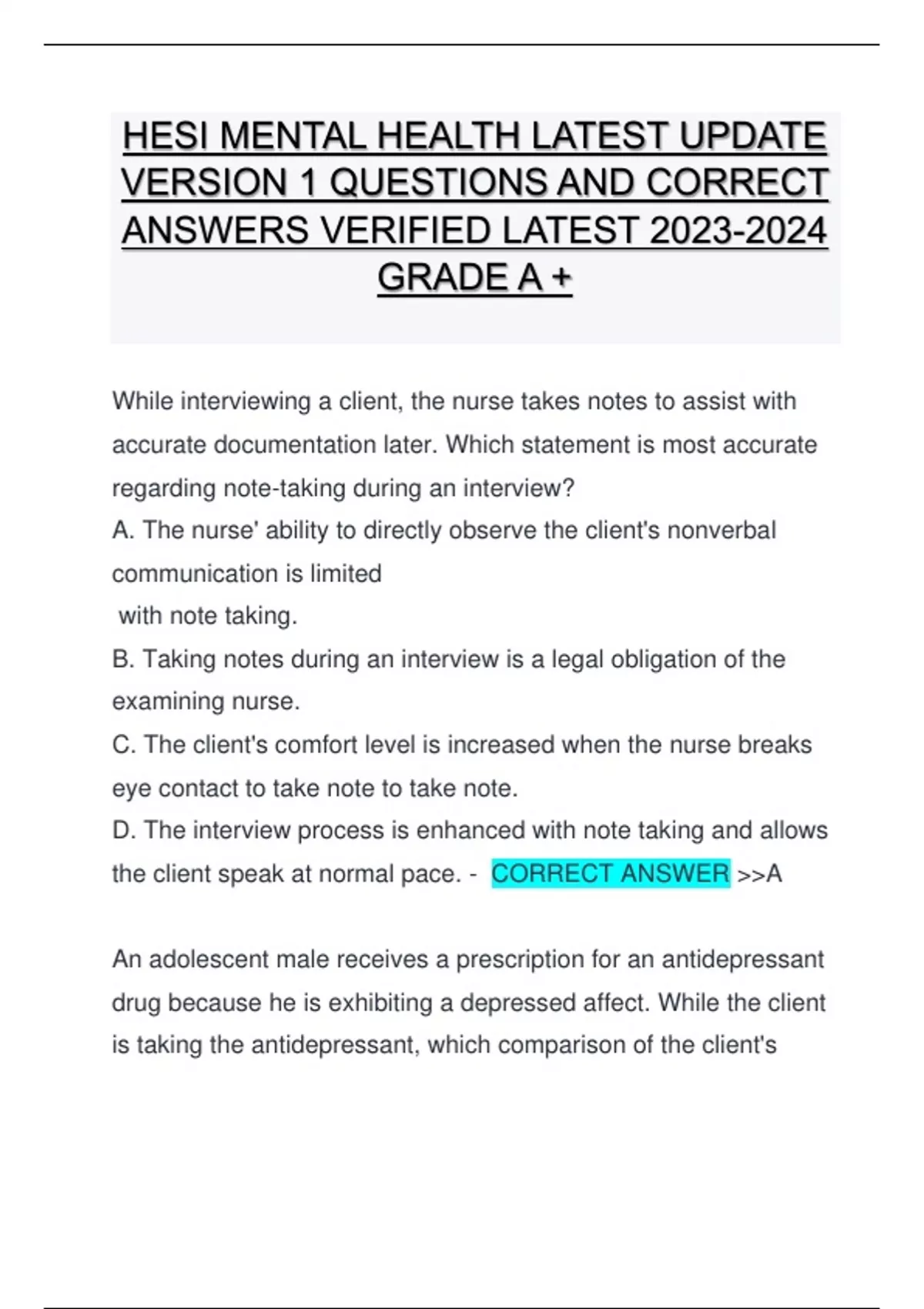 HESI MENTAL HEALTH LATEST UPDATE VERSION 1 QUESTIONS AND CORRECT ANSWERS VERIFIED LATEST GRADE A +