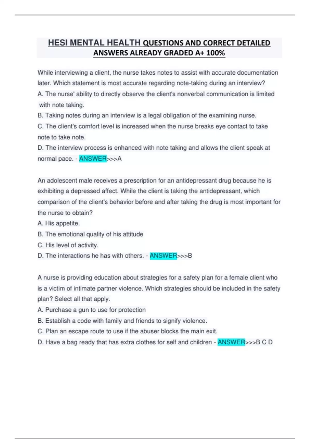 HESI MENTAL HEALTH QUESTIONS AND CORRECT DETAILED