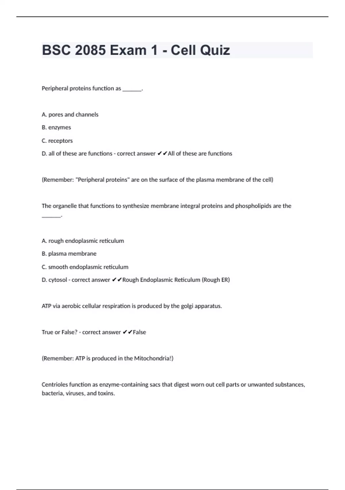 BSC 2085 Exam 1 - Cell Quiz well answered to pass