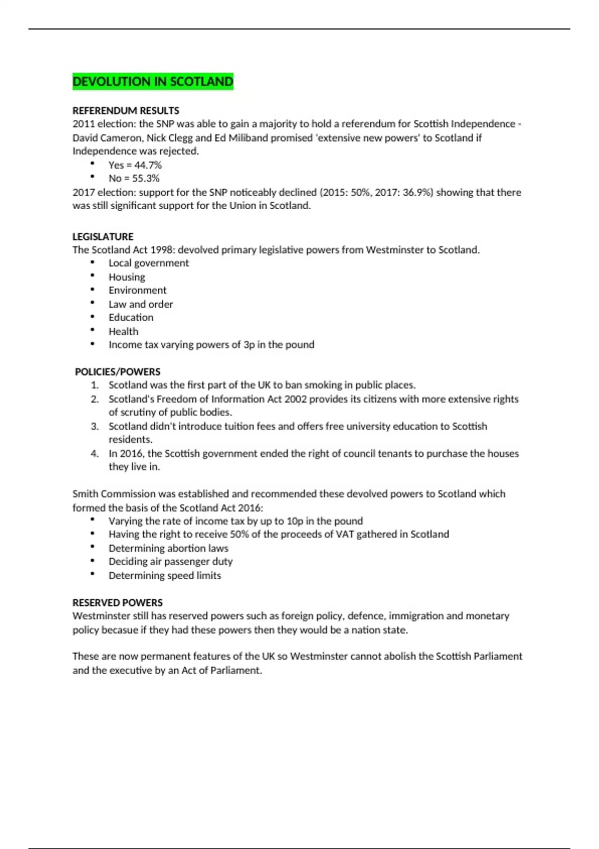 devolution in scotland - incl West Lothian question, primary and secondary legislative powers - tax varying power information and smoking bans and regional law