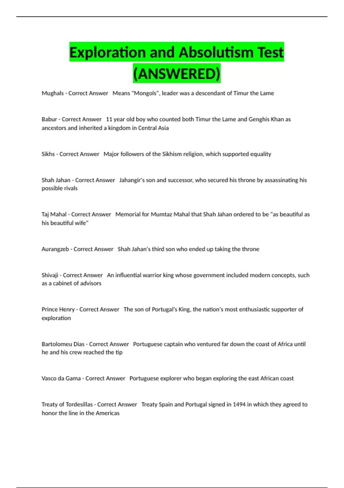 Treaty of Tordesillas - Correct Answer Treaty Spain and Portugal signed in 1494 in which they agreed to