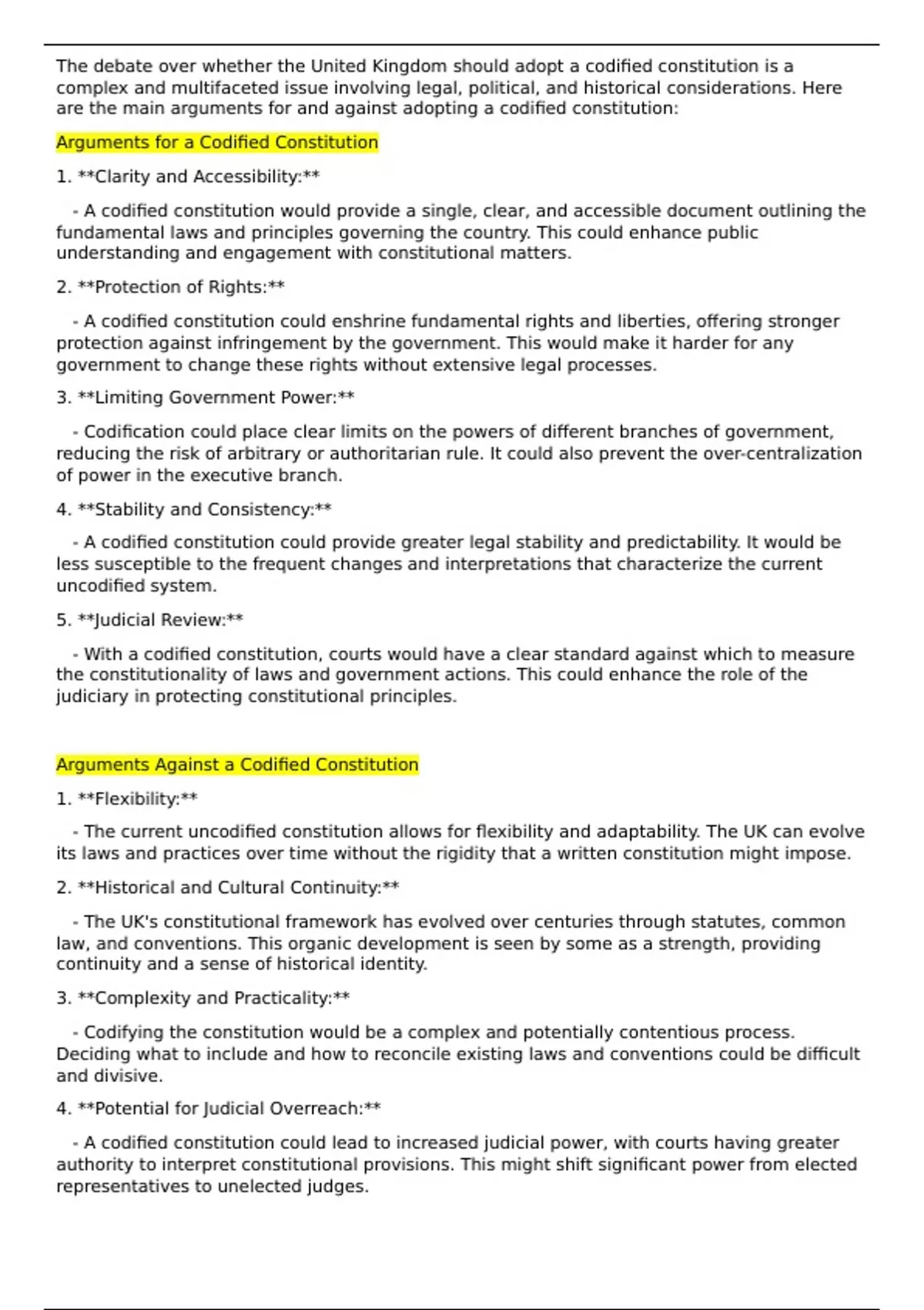 are the main arguments for and against adopting a codified constitution: