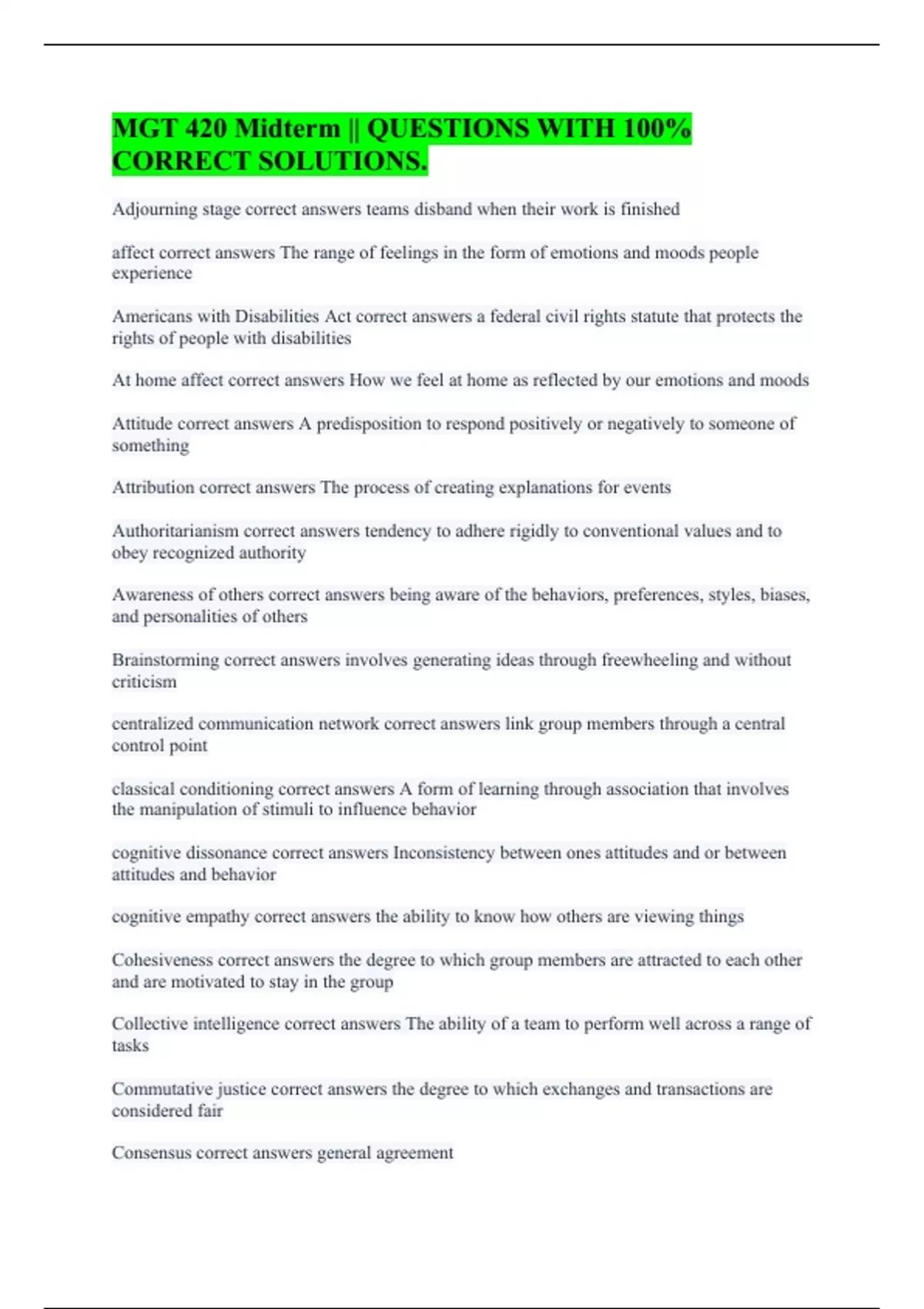 Adjourning stage correct answers teams disband when their work is finished affect correct answers The range of feelings in the form of emotions and moods people experience Americans with Disabilities Act correct answers a federal civil rights statute that protects the rights of people with disabilities At home affect correct answers How we feel at home as reflected by our emotions and moods Attitude correct answers A predisposition to respond positively or negatively to someone of something Attribution correct answers The process of creating explanations for events Authoritarianism correct answers tendency to adhere rigidly to conventional values and to obey recognized authority Awareness of others correct answers being aware of the behaviors, preferences, styles, biases, and personalities of others Brainstorming correct answers involves generating ideas through freewheeling and without criticism centralized communication network correct answers link group members through a central control point classical conditioning correct answers A form of learning through association that involves the manipulation of stimuli to influence behavior cognitive dissonance correct answers Inconsistency between ones attitudes and or between attitudes and behavior cognitive empathy correct answers the ability to know how others are viewing things Cohesiveness correct answers the degree to which group members are attracted to each other and are motivated to stay in the group Collective intelligence correct answers The ability of a team to perform well across a range of tasks Commutative justice correct answers the degree to which exchanges and transactions are considered fair Consensus correct answers general agreement