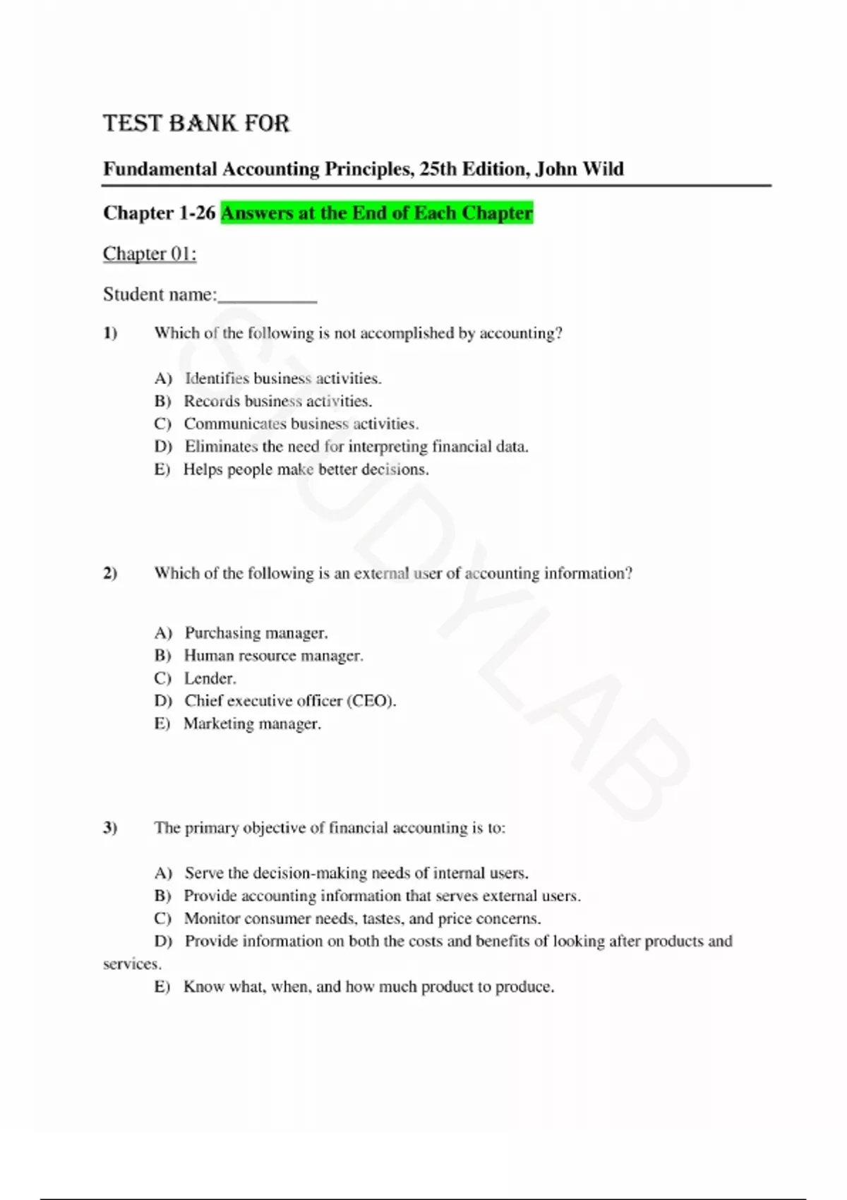 Test Bank - for Fundamental Accounting Principles, 25th Edition, John Wild, All Chapters 1-26 | Complete Guide A+