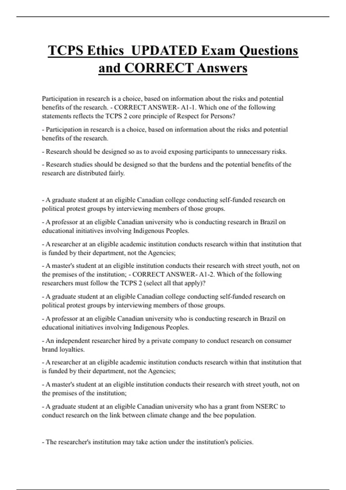 TCPS Ethics UPDATED Exam Questions and CORRECT Answers Participation in research is a choice, based on information about the risks and potential benefits of the research. - CORRECT ANSWER- A1-1. Which one of the following statements reflects the TCPS 2 core principle of Respect for Persons? - Participation in research is a choice, based on information about the risks and potential benefits of the research. - Research should be designed so as to avoid exposing participants to unnecessary risks. - Research studies should be designed so that the burdens and the potential benefits of the research are distributed fairly.