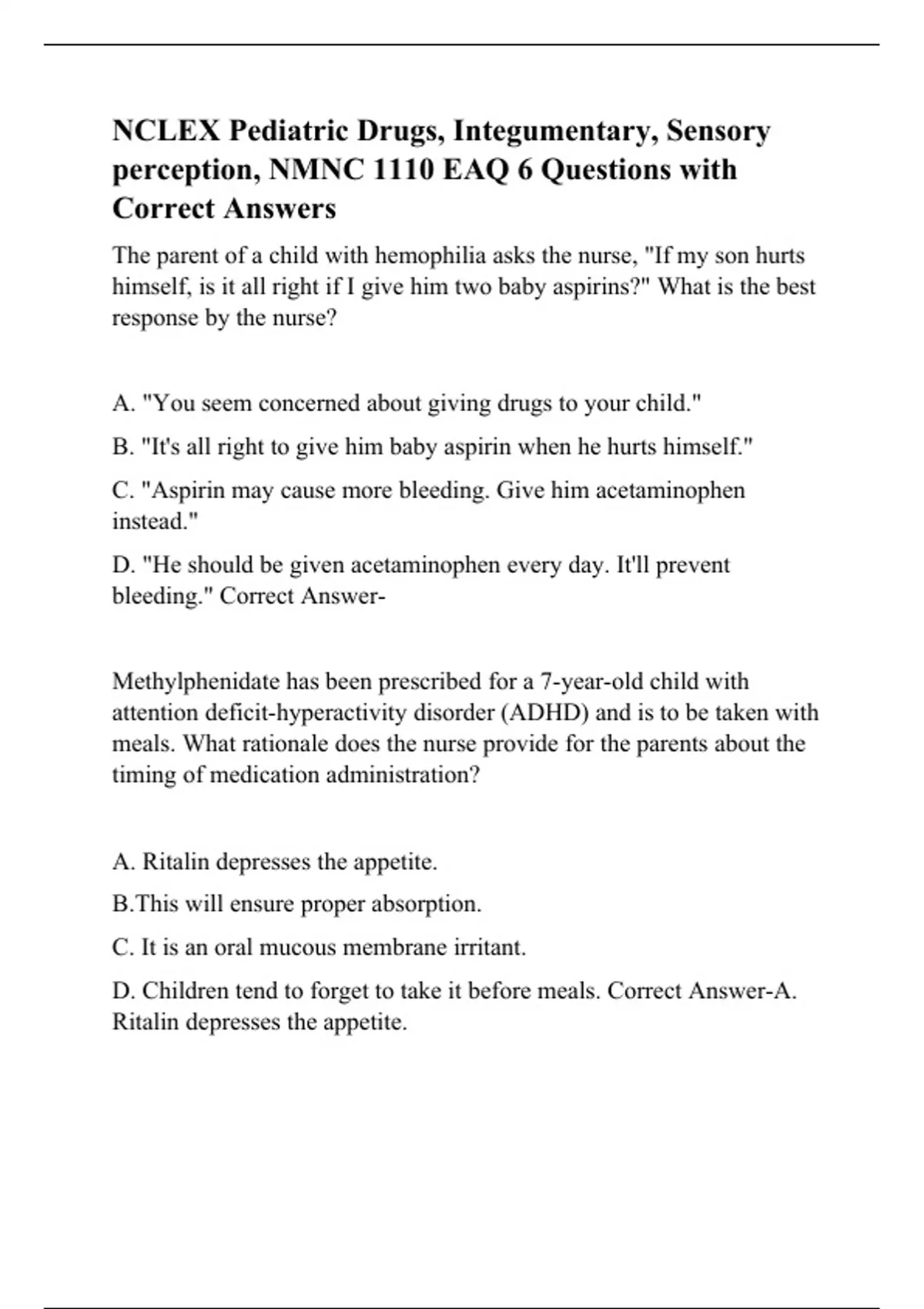 NCLEX Pediatric Drugs, Integumentary, Sensory perception, NMNC 1110 EAQ 6 Questions with Correct Answers