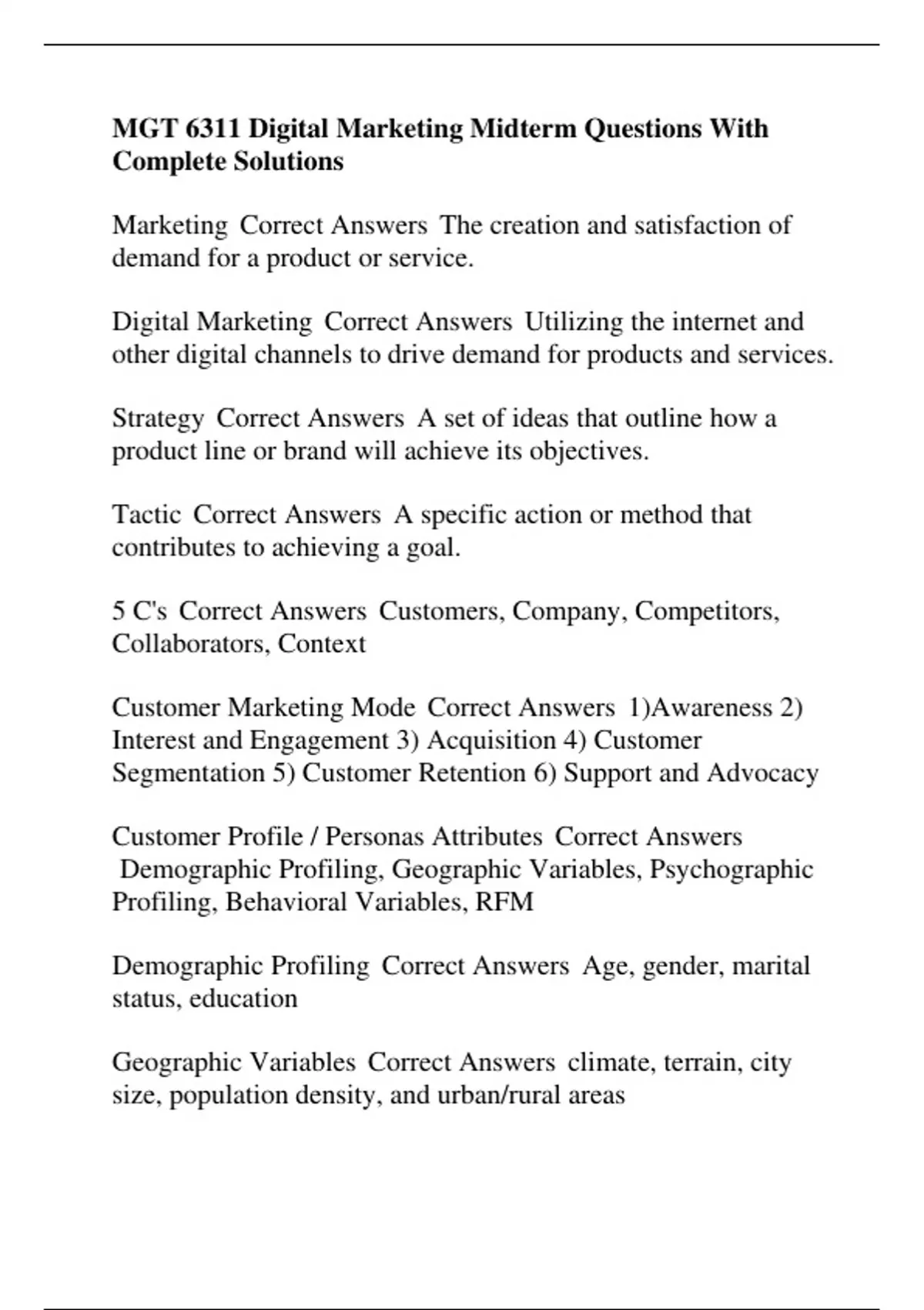 Marketing Correct Answers The creation and satisfaction of