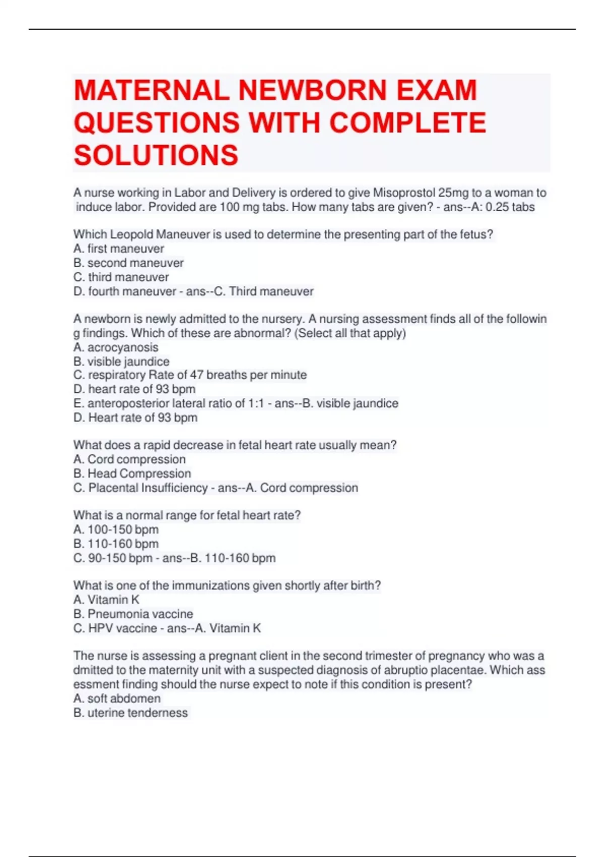 MATERNAL NEWBORN EXAM QUESTIONS WITH COMPLETE SOLUTIONS