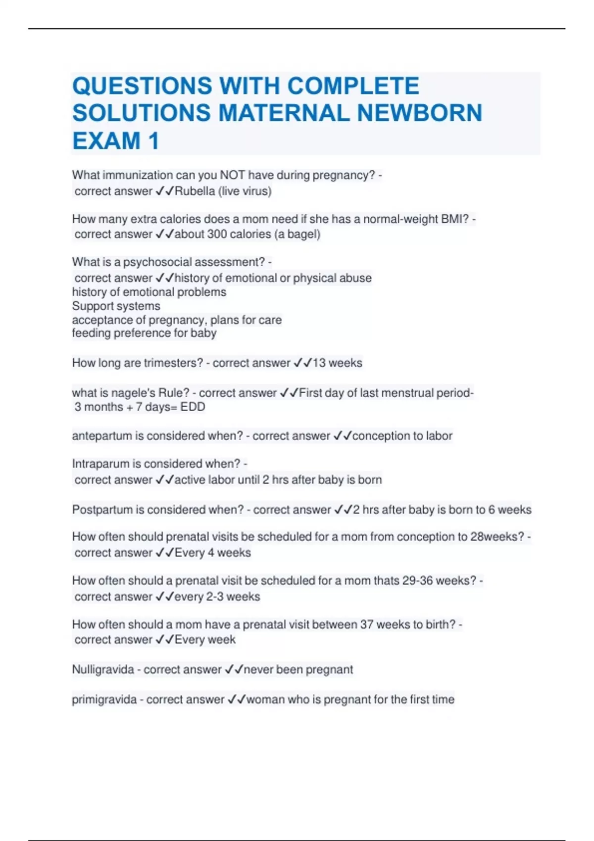 QUESTIONS WITH COMPLETE SOLUTIONS MATERNAL NEWBORN EXAM 1