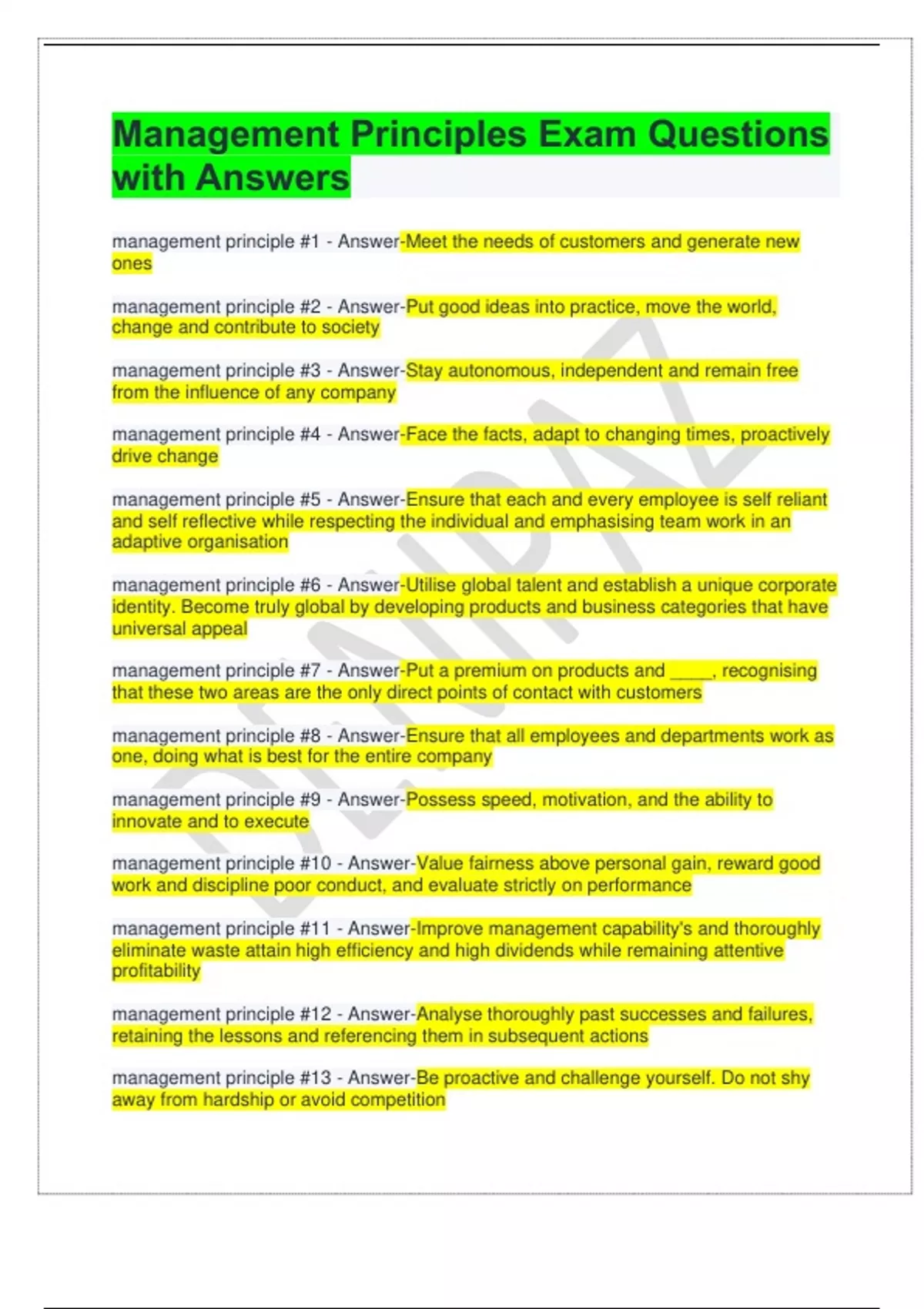 Management Principles Exam Questions with Answers management principle #1 - Answer-Meet the needs of customers and generate new ones management principle #2 - Answer-Put good ideas into practice, move the world, change and contribute to society management principle #3 - Answer-Stay autonomous, independent and remain free from the influence of any company management principle #4 - Answer-Face the facts, adapt to changing times, proactively drive change management principle #5 - Answer-Ensure that each and every employee is self reliant and self reflective while respecting the individual and emphasising team work in an adaptive organisation management principle #6 - Answer-Utilise global talent and establish a unique corporate identity. Become truly global by developing products and business categories that have universal appeal management principle #7 - Answer-Put a premium on products and ____, recognising that these two areas are the only direct points of contact with customers management principle #8 - Answer-Ensure that all employees and departments work as one, doing what is best for the entire company management principle #9 - Answer-Possess speed, motivation, and the ability to innovate and to execute management principle #10 - Answer-Value fairness above personal gain, reward good work and discipline poor conduct, and evaluate strictly on performance management principle #11 - Answer-Improve management capability's and thoroughly eliminate waste attain high efficiency and high dividends while remaining attentive profitability management principle #12 - Answer-Analyse thoroughly past successes and failures, retaining the lessons and referencing them in subsequent actions management principle #13 - Answer-Be proactive and challenge yourself. Do not shy away from hardship or avoid competition