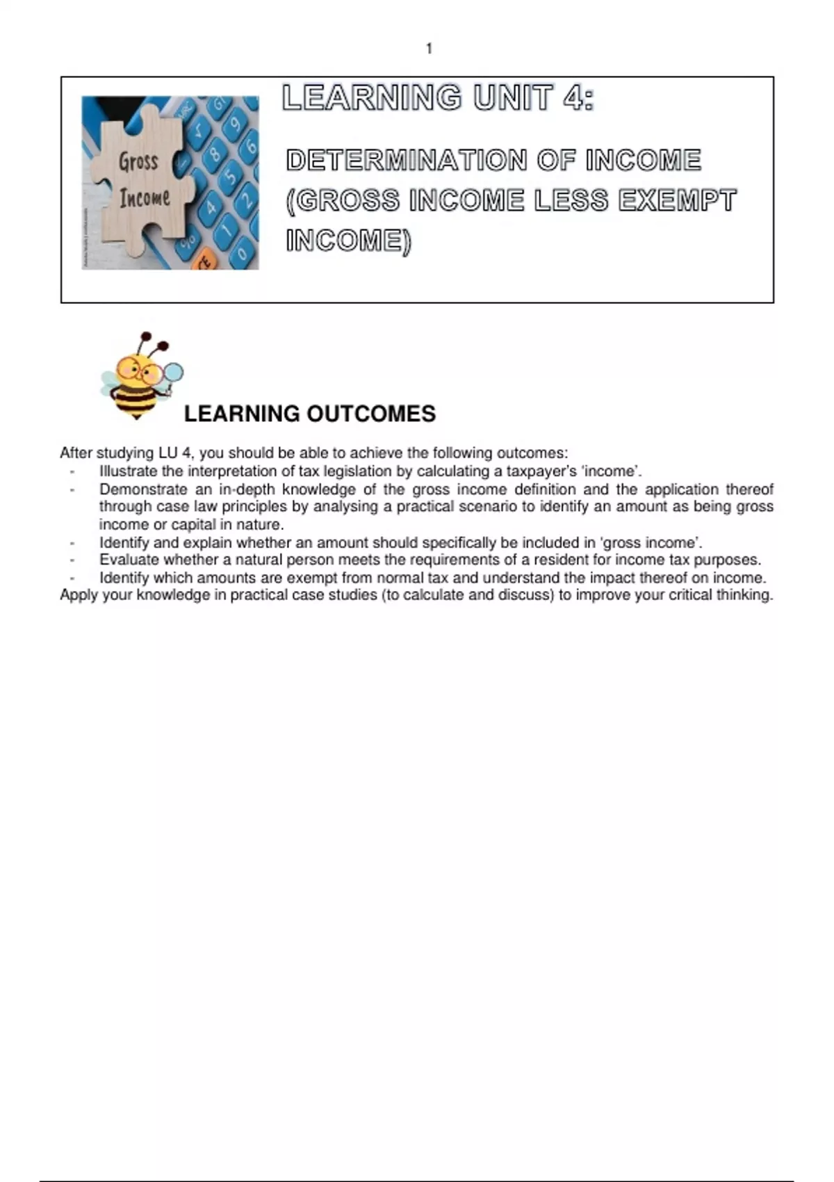 Learning unit 4 deals with income as defined in section 1 of the Income Tax Act, meaning gross income