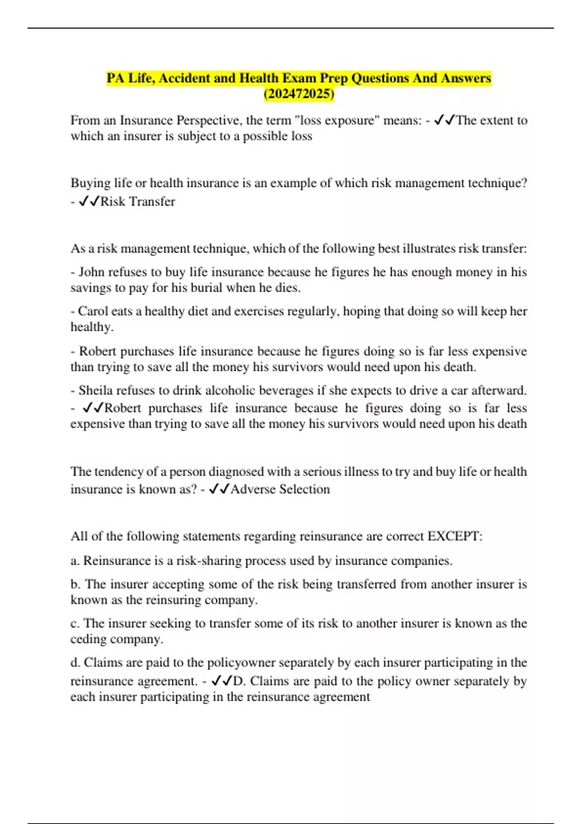 PA Life, Accident and Health Exam Prep Questions And Answers ()