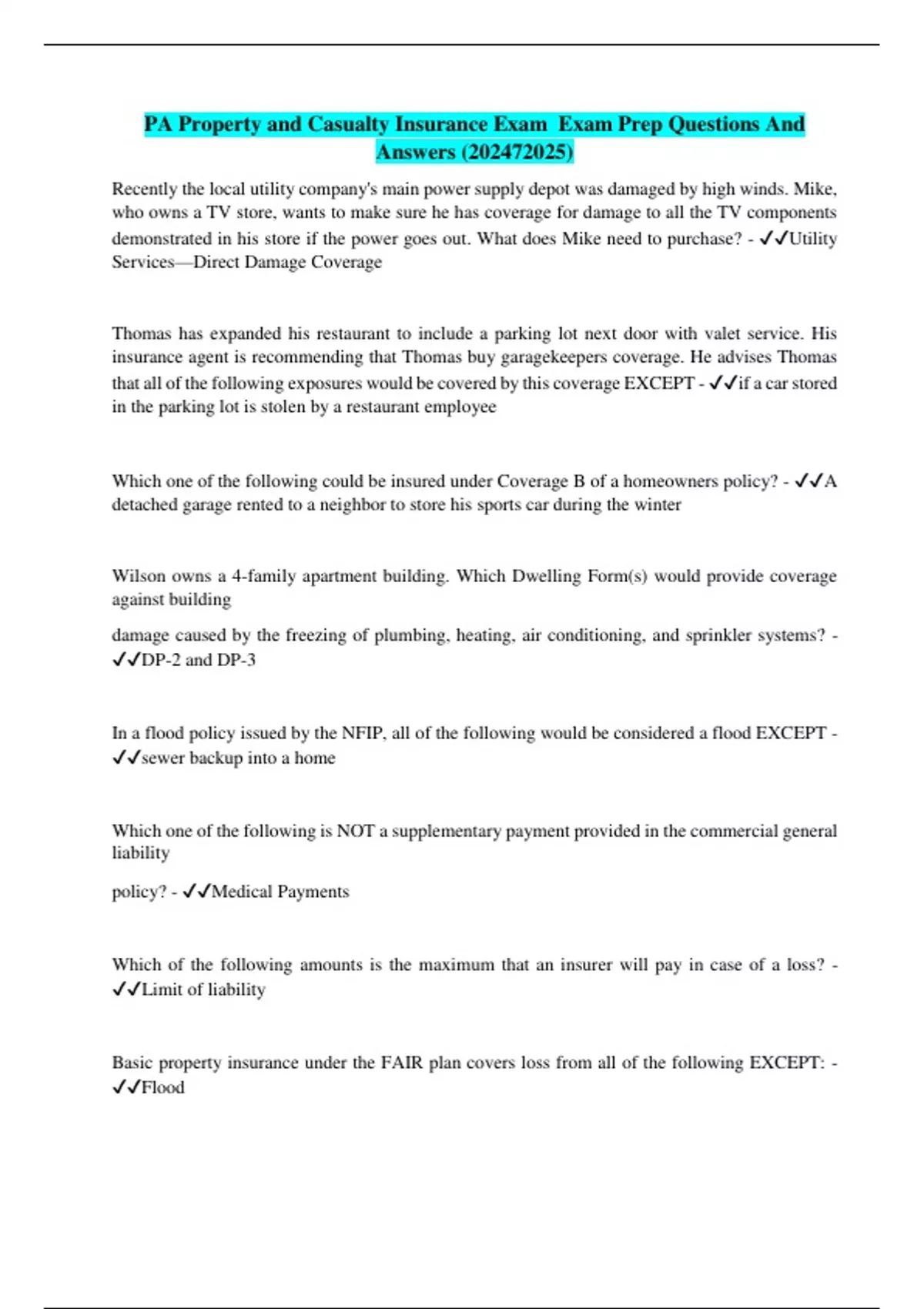 PA Property and Casualty Insurance Exam Exam Prep Questions And