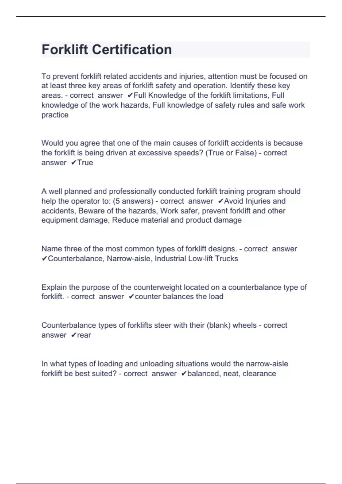 Forklift Certification Question and answers already passed Forklift Certification To prevent forklift related accidents and injuries, attention must be focused on at least three key areas of forklift safety and operation. Identify these key areas. - correct answer Full Knowledge of the forklift limitations, Full knowledge of the work hazards, Full knowledge of safety rules and safe work practice Would you agree that one of the main causes of forklift accidents is because the forklift is being driven at excessive speeds? (True or False) - correct answer True A well planned and professionally conducted forklift training program should help the operator to: (5 answers) - correct answer Avoid Injuries and accidents, Beware of the hazards, Work safer, prevent forklift and other equipment damage, Reduce material and product damage Name three of the most common types of forklift designs. - correct answer Counterbalance, Narrow-aisle, Industrial Low-lift Trucks Explain the purpose of the counterweight located on a counterbalance type of forklift. - correct answer counter balances the load Counterbalance types of forklifts steer with their (blank) wheels - correct answer rear In what types of loading and unloading situations would the narrow-aisle forklift be best suited? - correct answer balanced, neat, clearance
