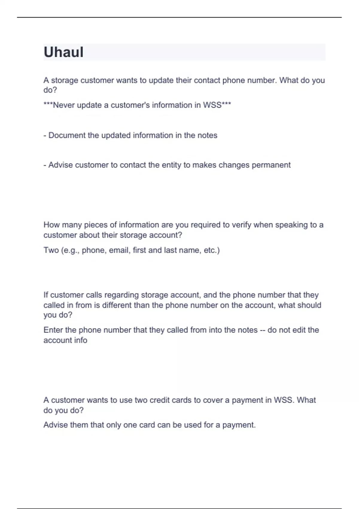 Uhaul Question and answers correctly solved Uhaul A storage customer wants to update their contact phone number. What do you do? ***Never update a customer's information in WSS*** - Document the updated information in the notes - Advise customer to contact the entity to makes changes permanent How many pieces of information are you required to verify when speaking to a customer about their storage account? Two (e.g., phone, email, first and last name, etc.) If customer calls regarding storage account, and the phone number that they called in from is different than the phone number on the account, what should you do? Enter the phone number that they c