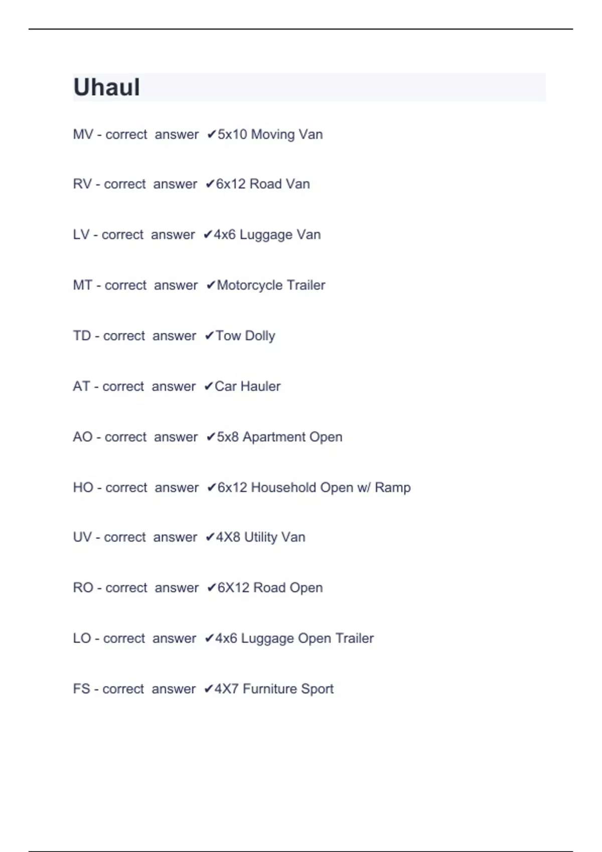Uhaul Questions with complete solution Uhaul MV - correct answer 5x10 Moving Van RV - correct answer 6x12 Road Van LV - correct answer 4x6 Luggage Van MT - correct answer Motorcycle Trailer TD - correct answer Tow Dolly AT - correct answer Car Hauler