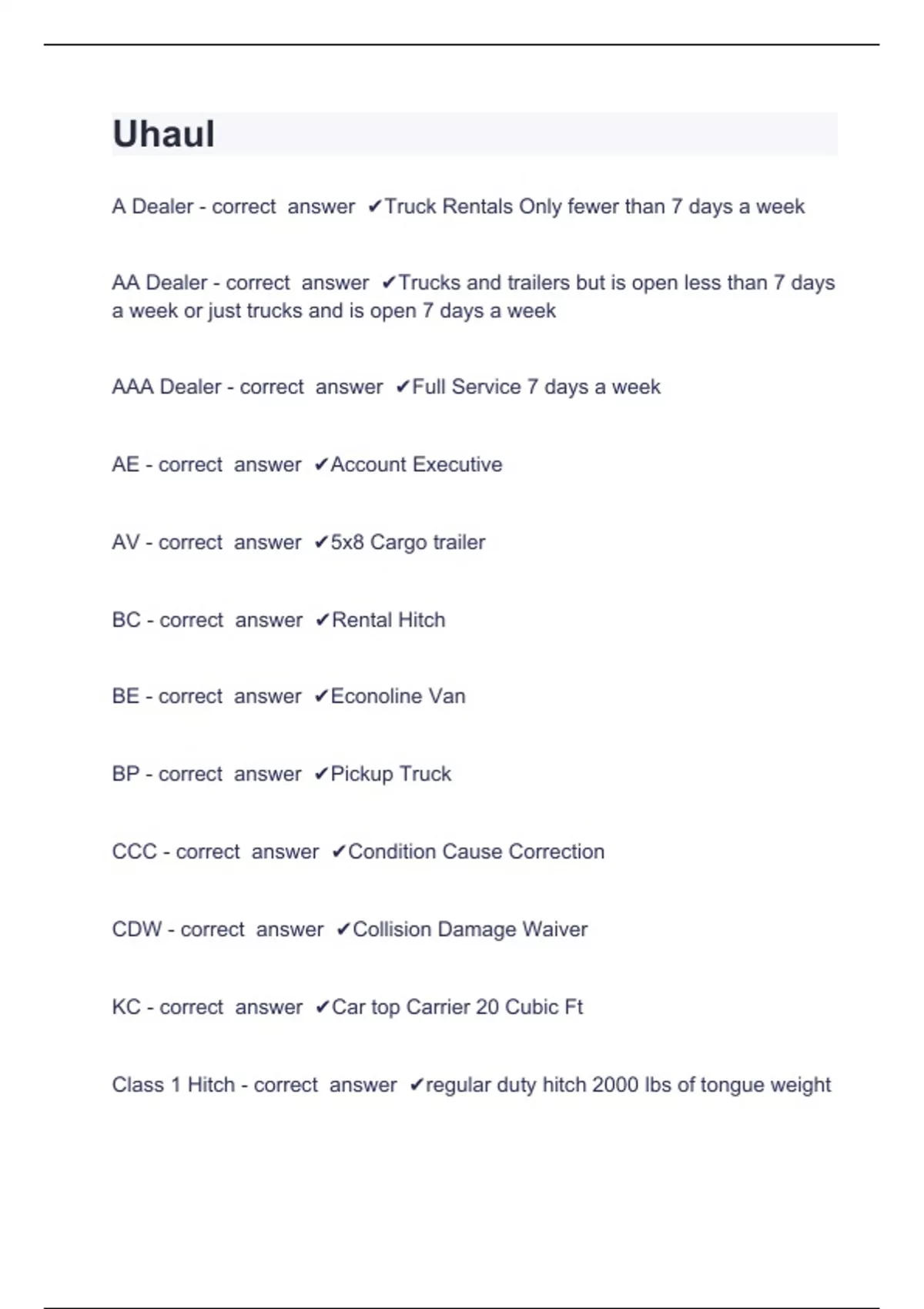 Uhaul Question and answers 100% correct Uhaul A Dealer - correct answer Truck Rentals Only fewer than 7 days a week AA Dealer - correct answer Trucks and trailers but is open less than 7 days a week or just trucks and is open 7 days a week AAA Dealer - correct answer Full Service 7 days a week AE - correct answer Account Executive AV - correct answer 5x8 Cargo trailer BC - correct answer Rental Hitch BE - correct answer Econoline Van BP - correct answer Pickup Truck CCC - correct answer Condition Cause Correction CDW - correct answer Collision Damage Waiver KC - correct answer