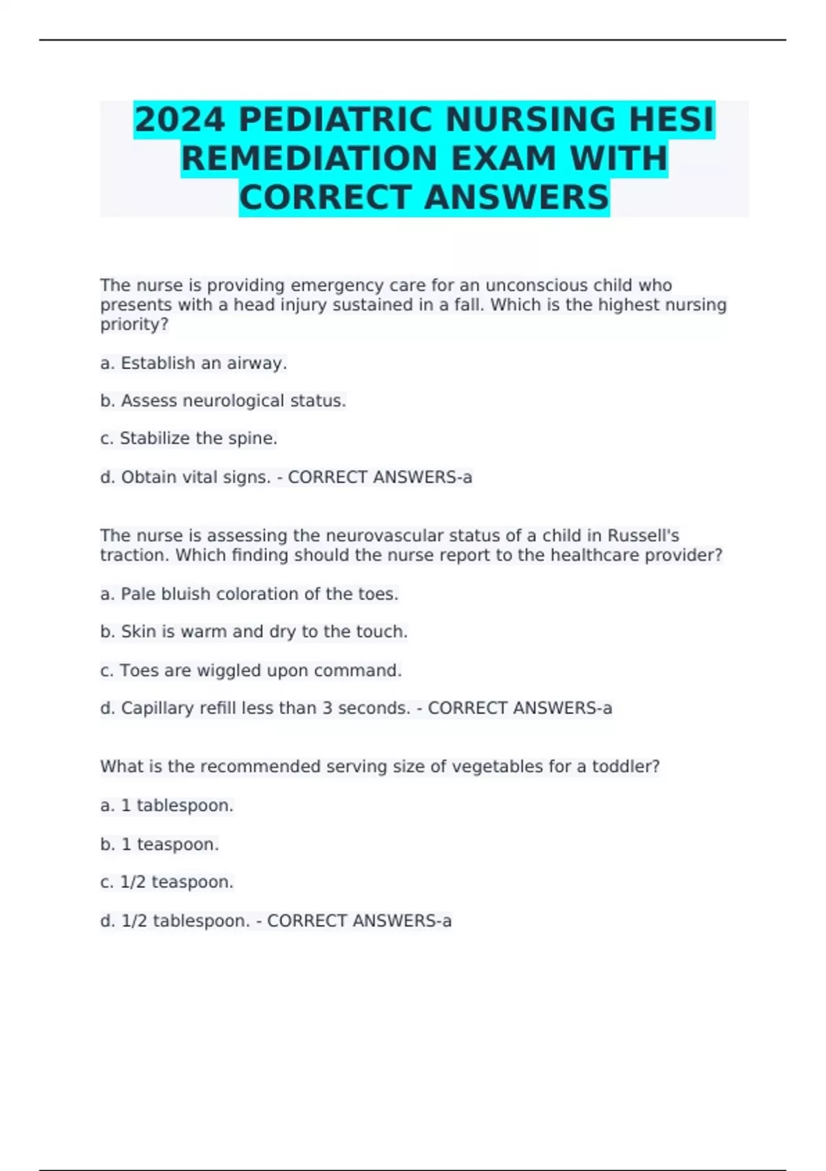 2024 PEDIATRIC NURSING HESI REMEDIATION EXAM WITH CORRECT ANSWERS