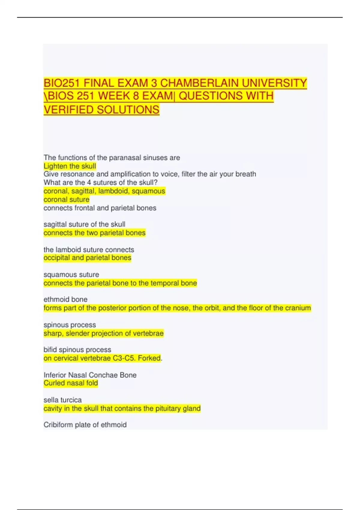 BIO251 FINAL EXAM 3 CHAMBERLAIN UNIVERSITY