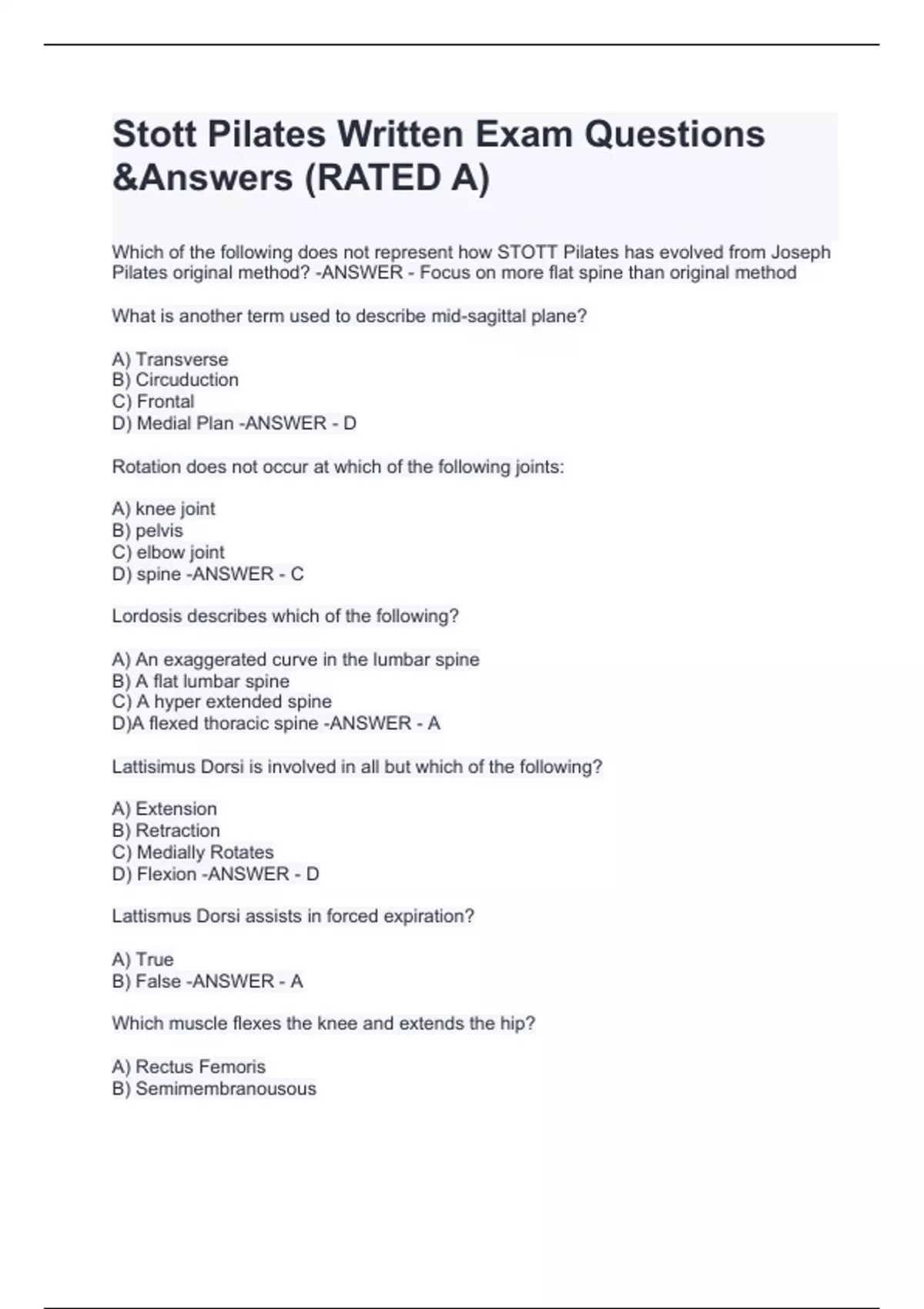 Which of the following does not represent how STOTT Pilates has evolved from Joseph Pilates original method? -ANSWER - Focus on more flat spine than original method What is another term used to describe mid-sagittal plane? A) Transverse B) Circuduction C) Frontal D) Medial Plan -ANSWER - D Rotation does not occur at which of the following joints: A) knee joint B) pelvis C) elbow joint D) spine -ANSWER - C Lordosis describes which of the following? A) An exaggerated curve in the lumbar spine B) A flat lumbar spine C) A hyper extended spine D)A flexed thoracic spine -ANSWER - A Lattisimus Dorsi is involved in all but which of the following? A) Extension B) Retraction C) Medially Rotates D) Flexion -ANSWER - D Lattismus Dorsi assists in forced expiration? A) True B) False -ANSWER - A Which muscle flexes the knee and extends the hip? A) Rectus Femoris B) Semimembranousous C) Semitendinous