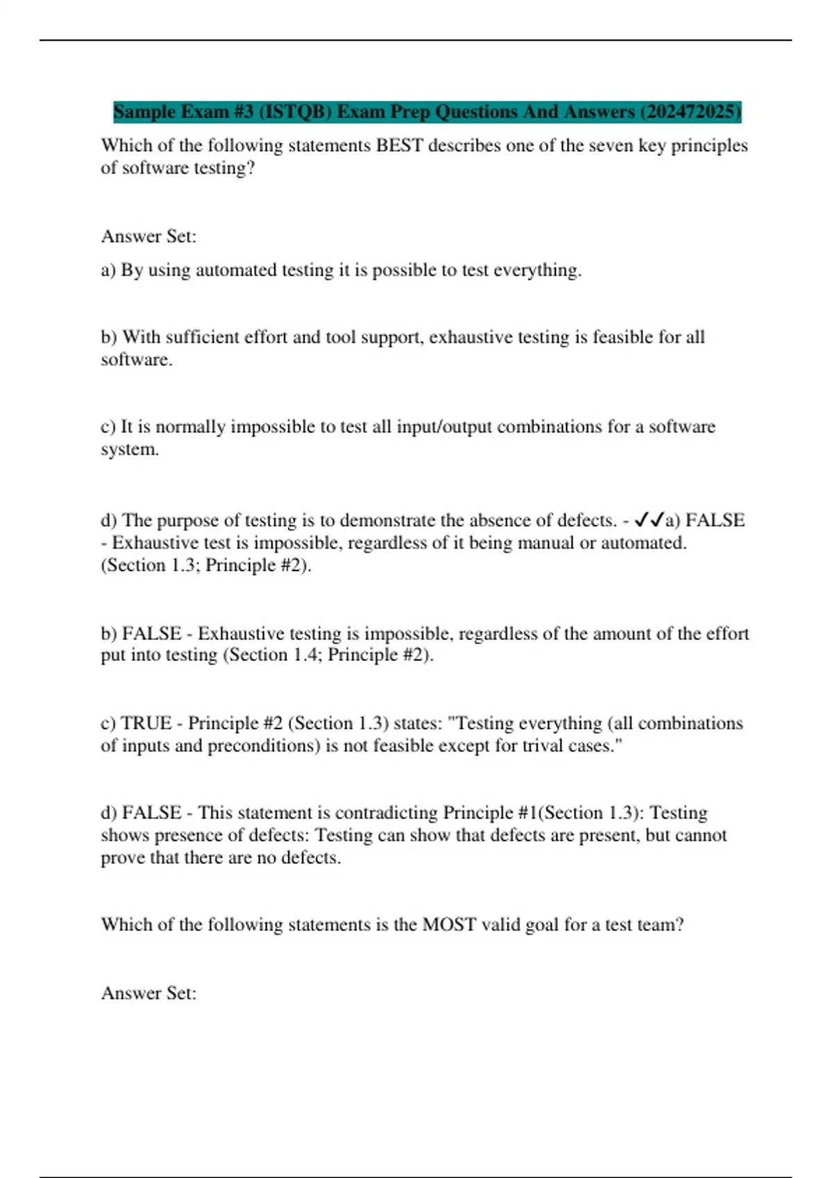 d) The purpose of testing is to demonstrate the absence of defects. - ✔✔a) FALSE