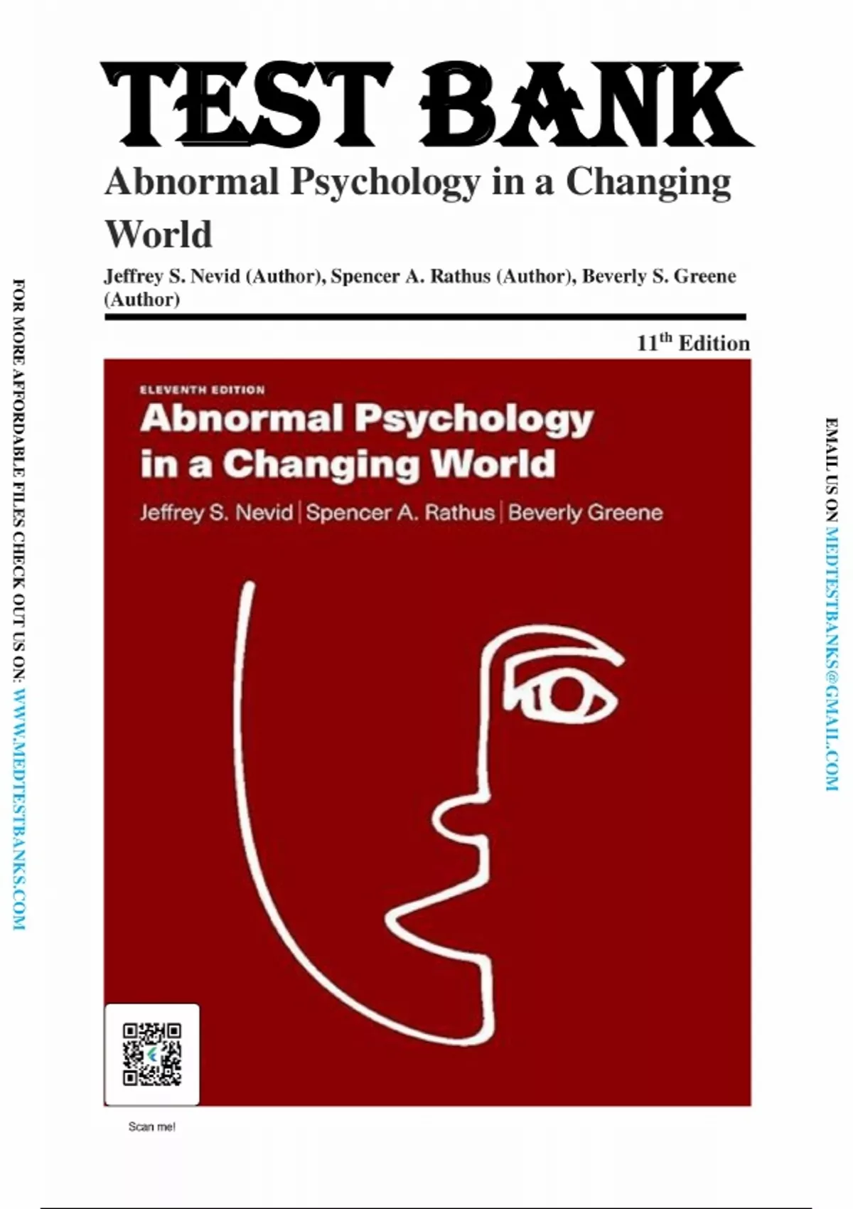 Test Bank for Abnormal Psychology in a Changing World 11e 11th Edition by Jeffrey S. Nevid; Spencer A. Rathus. Introduction and Methods of Research 2. Contemporary Perspectives on Abnormal Behavior and Methods of Treatment 3. Classification and Assessment of Abnormal Behavior 4. Stress-Related Disorders 5. Anxiety Disorders and Obsessive-Compulsive and Related Disorders 6. Dissociative Disorders, Somatic Symptom and Related Disorders, and Psychological Factors Affecting Physical Health 7. Mood Disorders and Suicide 8. Substance-Related and Addictive Disorders 9. Eating Disorders and Sleep-Wake Disorders 10. Disorders Involving Gender and Sexuality 11. Schizophrenia Spectrum Disorders 12. Personality Disorders and Impulse-Control Disorders 13. Disorders Diagnosed in Childhood and Adolescence 14. Neurocognitive Disorders and Disorders Related to Aging 15. Abnormal Psychology and the Law